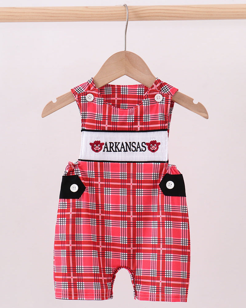 Get your little fan ready for kickoff in classic Southern style with the Arkansas Game Day Smocked Boy JonJon. This timeless one-piece features bold red plaid fabric with a smocked chest panel embroidered with “Arkansas” and charming hog details for a spirited game day look.