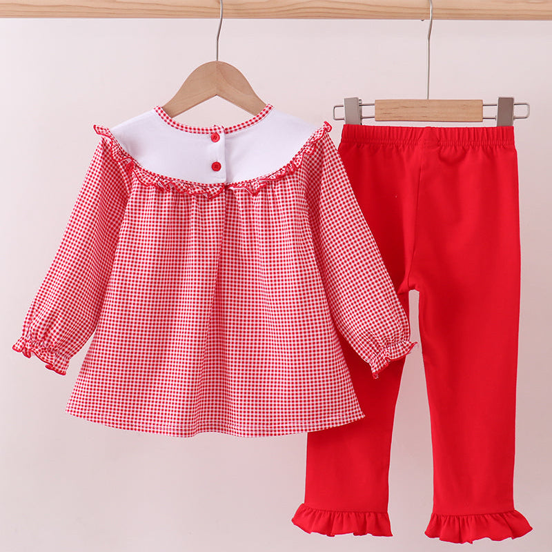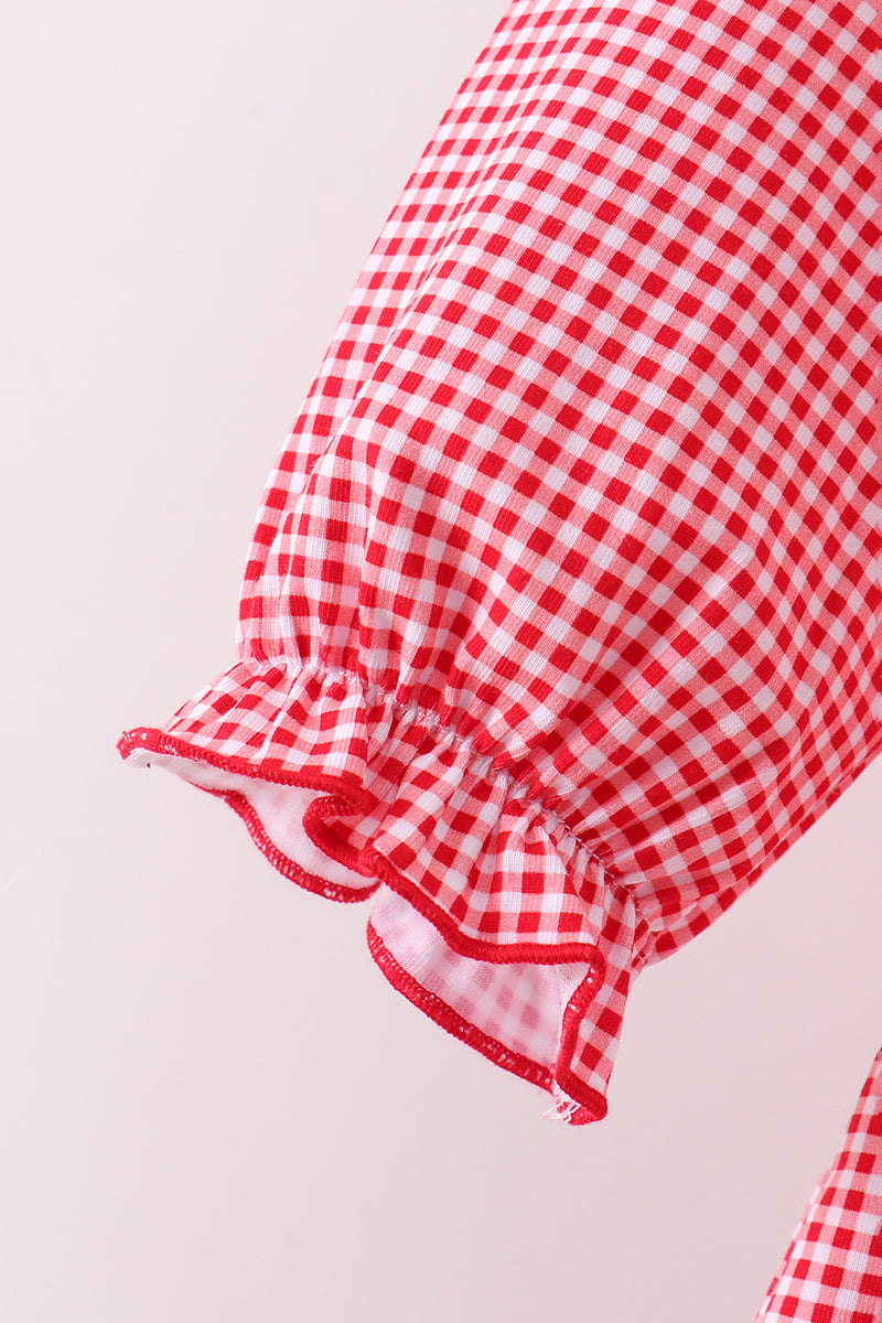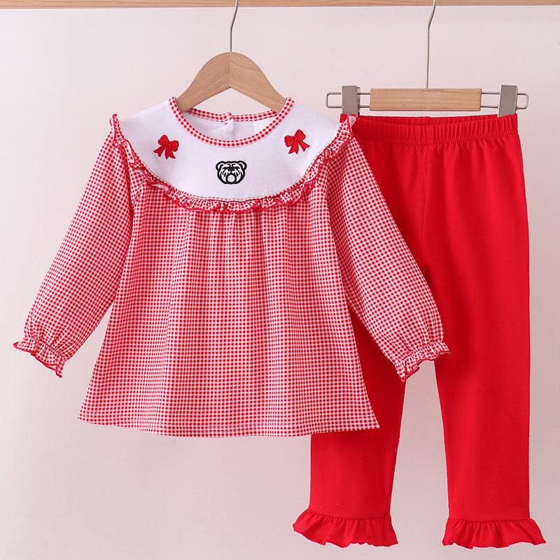 Dress your little GA fan in adorable game-day style with the Athens Cutie Check Ruffle Pants Set! This charming two-piece outfit features a red gingham tunic with a sweet ruffle trim and an embroidered bulldog and bows on the yoke — the perfect blend of classic Southern charm and team spirit.