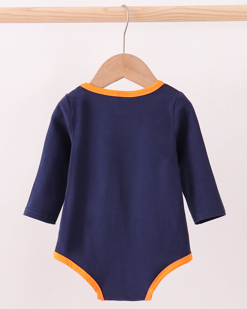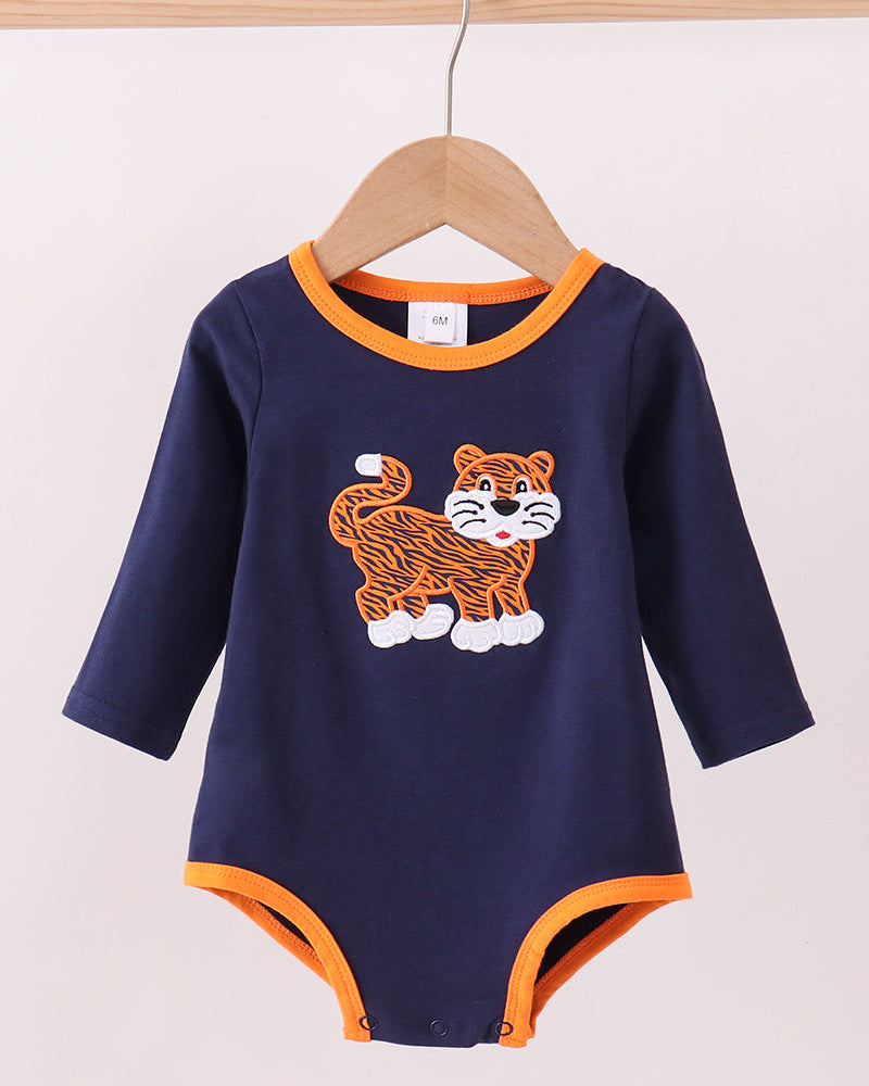 Show your Tiger pride early with our Auburn Spirit Tiger Boy Bubble! This charming long-sleeve bubble features a playful tiger applique on a deep navy background, accented with bright orange trim for the perfect Auburn-inspired look.