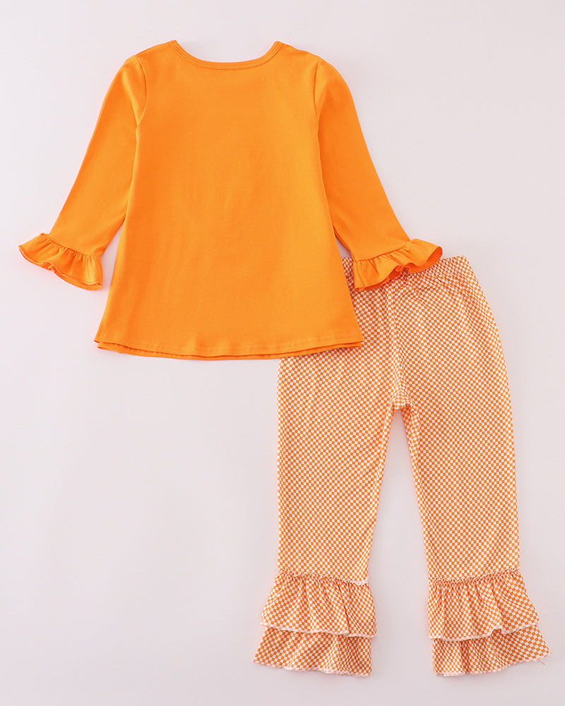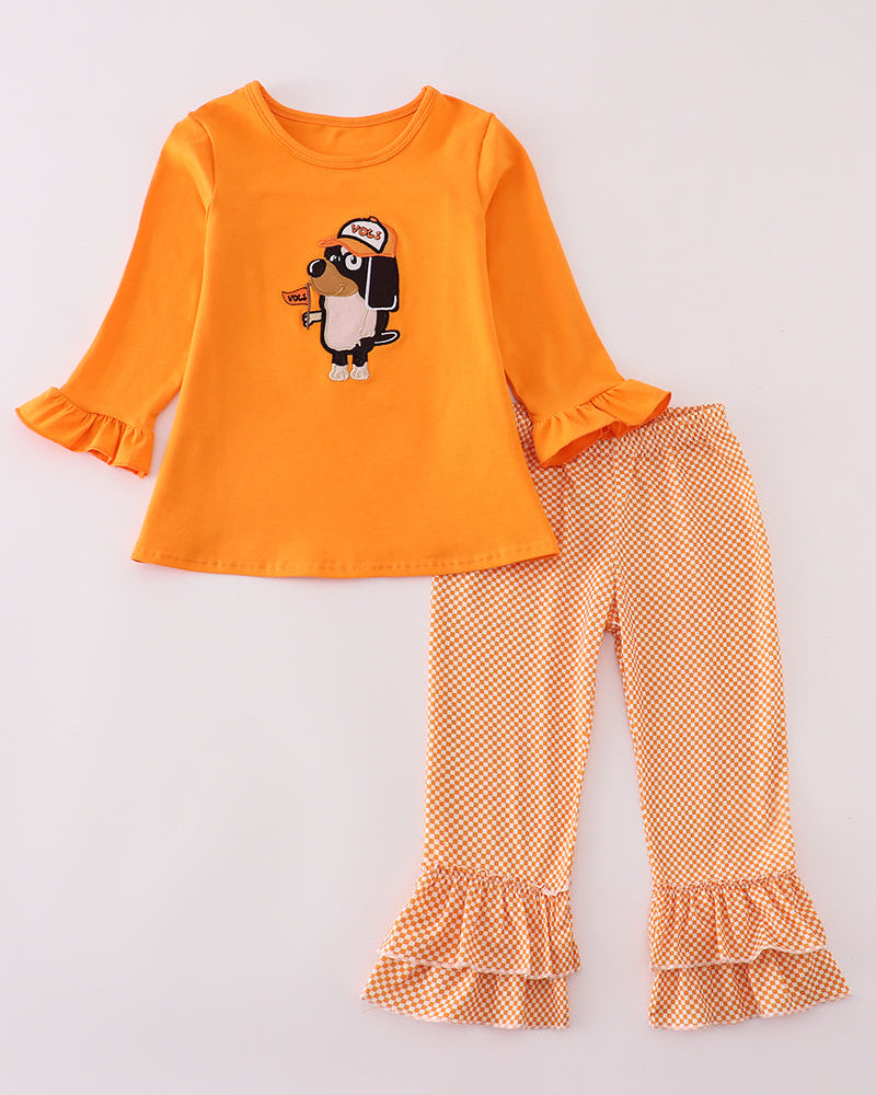Get her game-day ready with our Little Volunteer Game Day Ruffle Pants Set! This adorable orange outfit features a playful Vols-inspired pup applique on the top — complete with ruffle-trim sleeves for extra charm. The matching checkered ruffle pants bring all the spirit and sweetness, perfect for cheering on Tennessee in style.