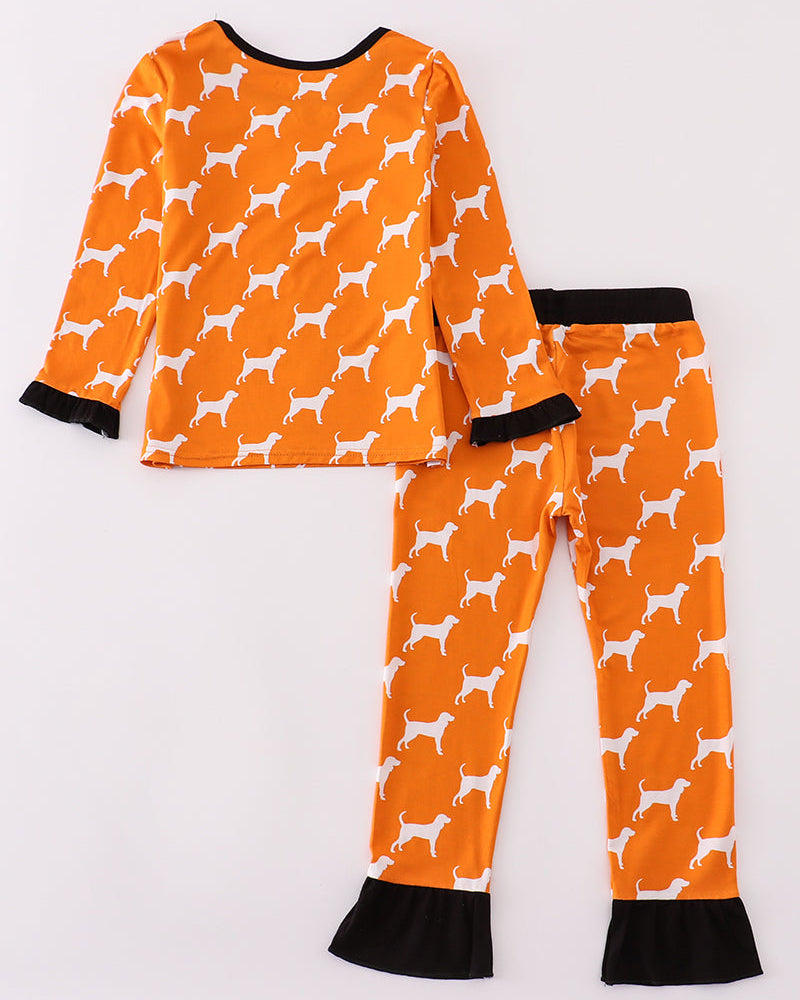 Cozy up in team spirit with our Volunteer Hound Parade Bamboo Ruffle Pajamas Set! Made from luxuriously soft bamboo fabric, this adorable PJ set features an allover white hound silhouette print on bright Volunteer orange — perfect for every little UT fan.
