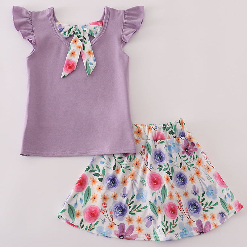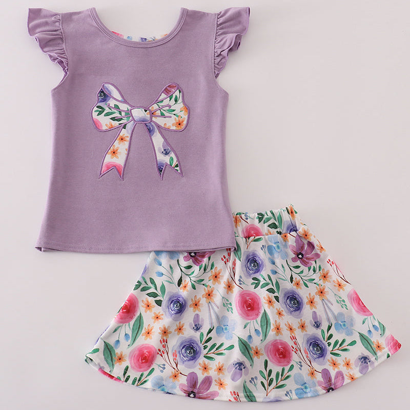 Let her play, twirl, and shine in the Lavender Petal Bow Active Skort Set! This adorable two-piece outfit features a soft lavender top with a beautifully appliquéd floral bow and sweet ruffle sleeves. The matching floral skort brings the perfect blend of comfort and style, offering the look of a skirt with the practicality of built-in shorts.