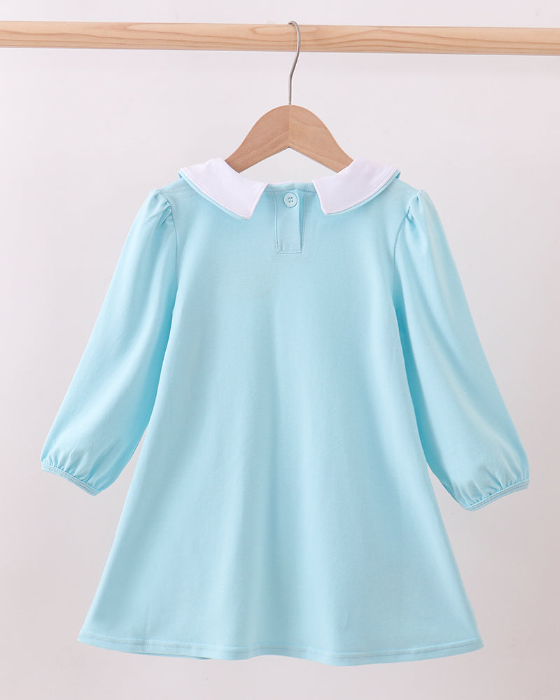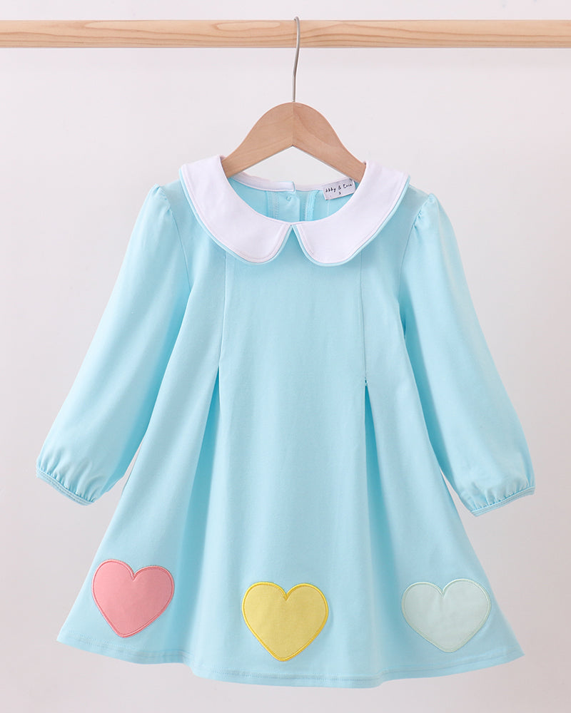 Sweet, simple, and full of charm—our Candy Kiss Hearts Dress is the perfect everyday Valentine-inspired outfit for your little girl. Designed in a soft pastel blue with a crisp white Peter Pan collar, this darling dress features three oversized appliqué hearts along the hem in pink, yellow, and mint for a playful pop of color.