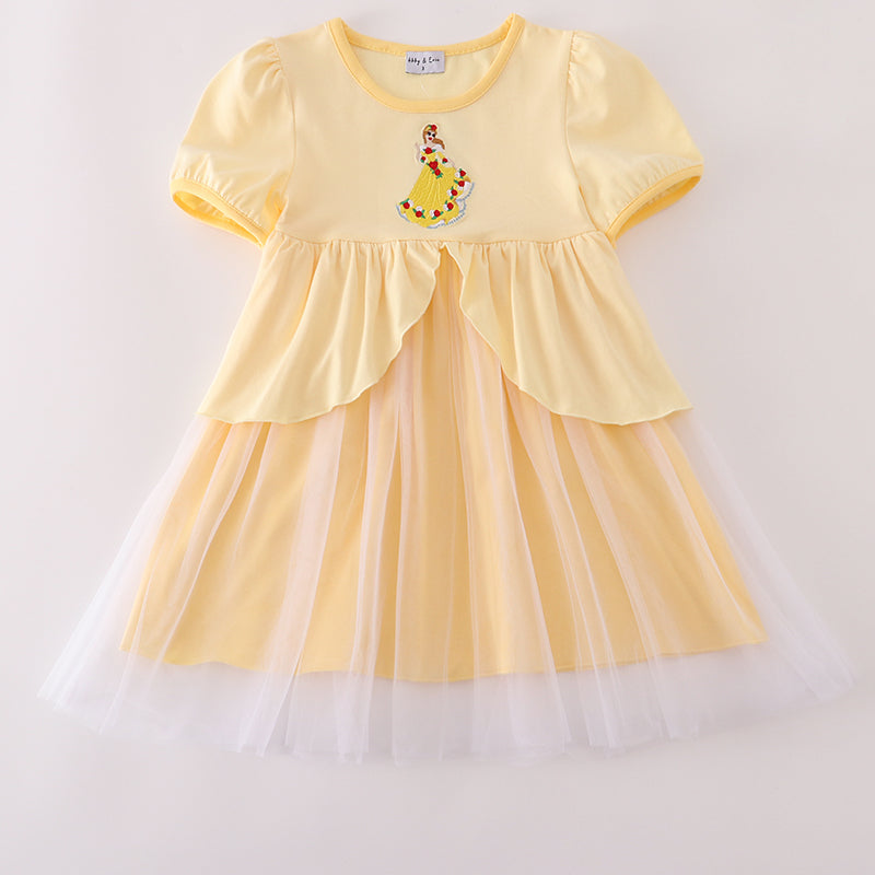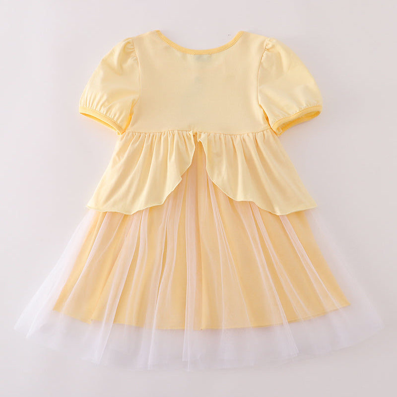 Your little one will feel like storybook royalty in the Golden Belle Ruffle Dress. This charming yellow princess dress features a soft knit bodice, a beautifully embroidered Belle-inspired character, and a double-layered ruffle overlay that adds the perfect touch of elegance. The full tulle skirt offers dreamy twirl power, making it ideal for birthday parties, magical vacations, pictures, or everyday princess play. Comfortable, lightweight, and absolutely enchanting — this dress brings fairytales to life.