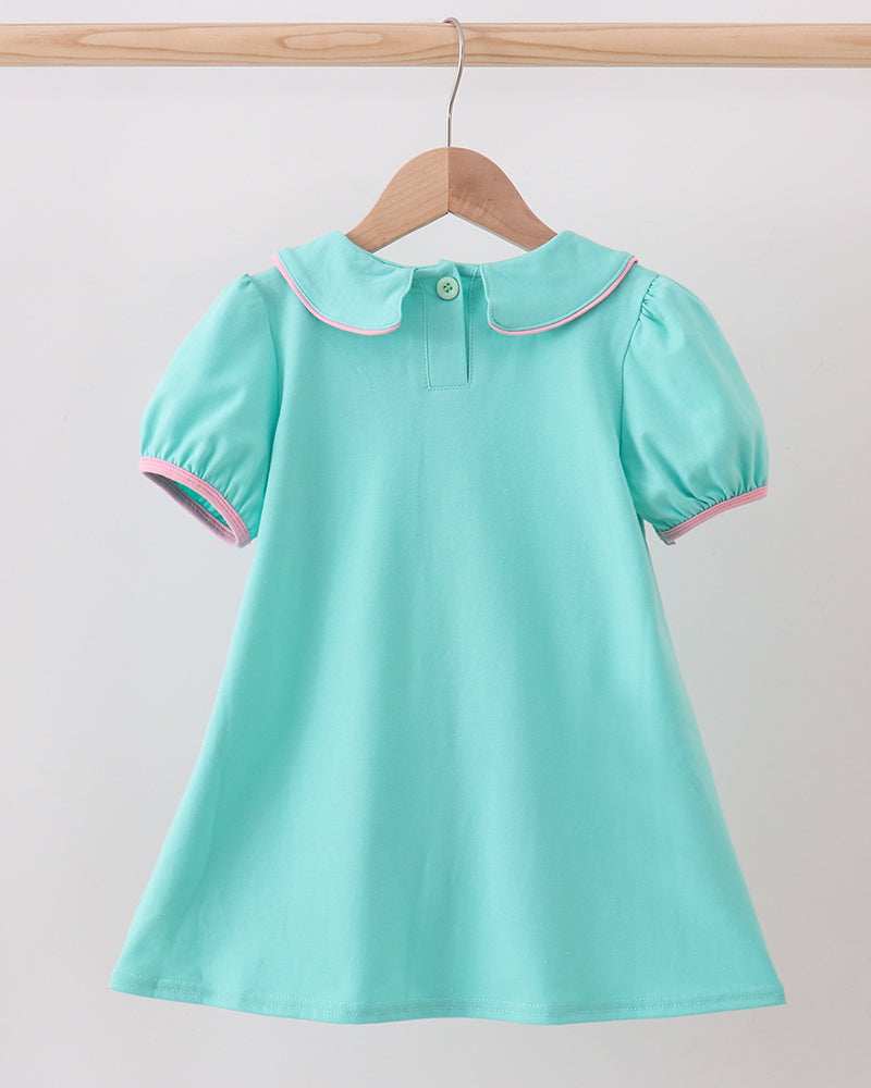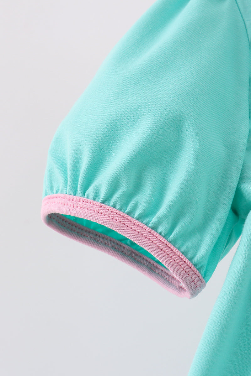 - 🌟 Whimsical Design – Mint green dress with puff sleeves and pink trim for a sweet holiday look.