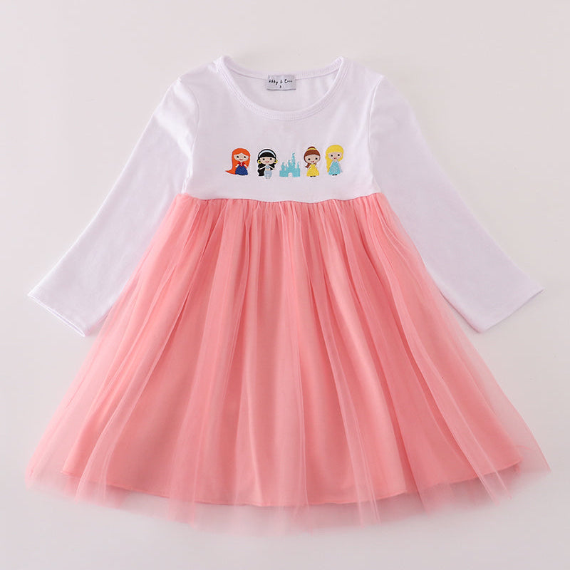 Let your little one step into a magical storybook world with our Storybook Princess Embroidered Pink Tulle Dress. Featuring adorable embroidered princess characters and a sparkling fairytale castle across the chest, this enchanting dress is designed for twirls, play, and pretend royal adventures.