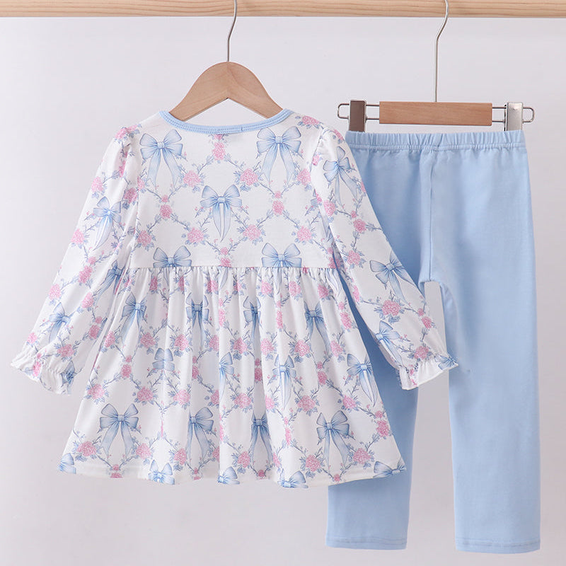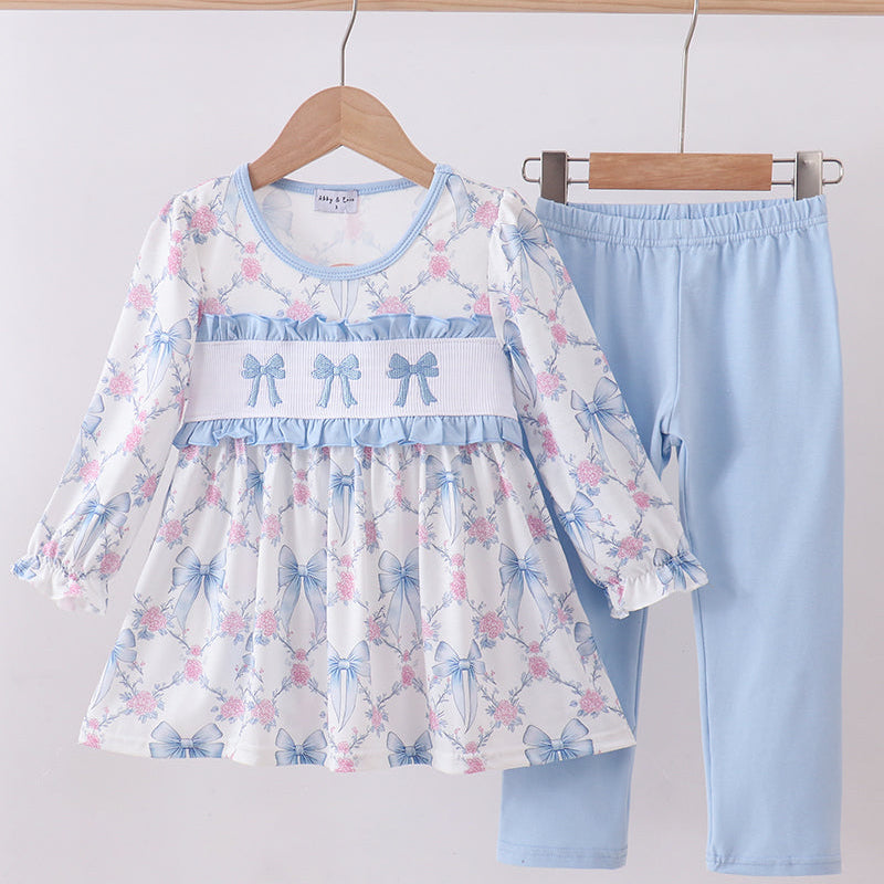 Sweet, soft, and timeless, the Blue Bow Garden Smocked Girl Pants Set is a beautiful outfit made for little girls who love classic charm. This two-piece set features a delicate floral and bow print tunic with a smocked chest panel accented by dainty blue bows, finished with soft ruffle trim for an extra touch of sweetness.