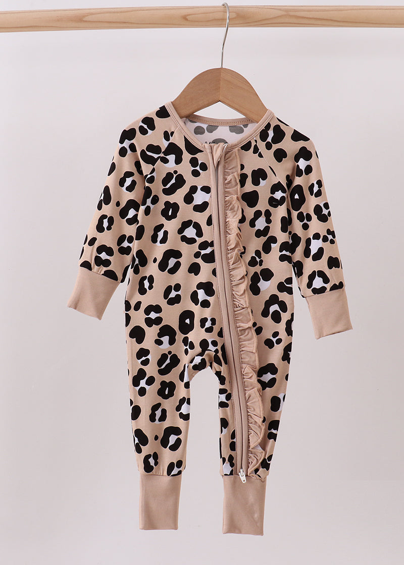 Wildly adorable and unbelievably soft, the Luna Leopard Bamboo Ruffle Zip Baby Romper is a must-have for stylish little ones. Crafted from silky bamboo fabric, this one-piece features a modern leopard print paired with a sweet ruffle accent along the zipper for the perfect blend of trendy and charming.