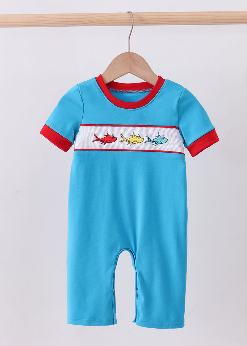 The One Fish Two Fish Smocked Boy Romper is a timeless, playful outfit perfect for little ones who love classic style with a fun twist. Featuring charming fish embroidery across the smocked chest panel, this romper brings storybook charm to everyday wear.