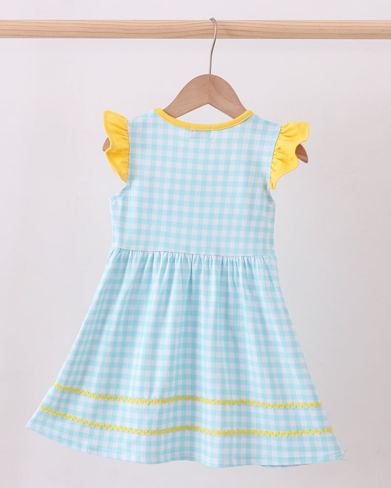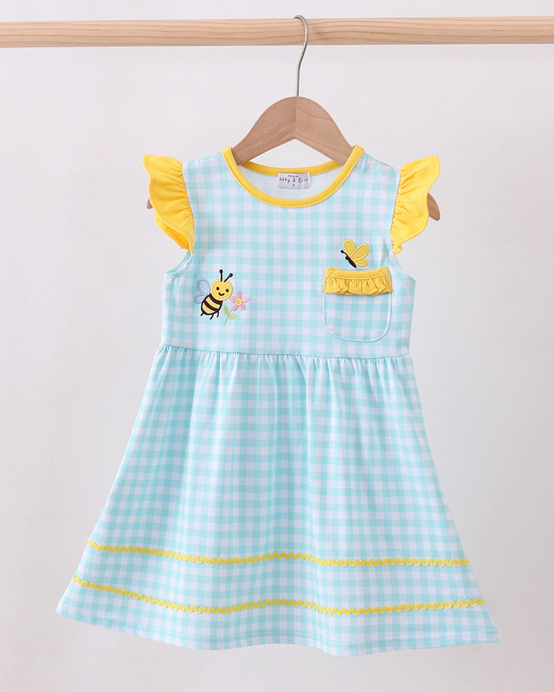 Bright, cheerful, and full of charm, the Honey & Flutter Gingham Ruffle Dress is a sweet standout for your little one’s warm-weather wardrobe. Designed in soft blue gingham with adorable embroidered bee details, this dress is finished with sunny yellow flutter sleeves and playful ric-rac trim for a look that’s as happy as a summer day.