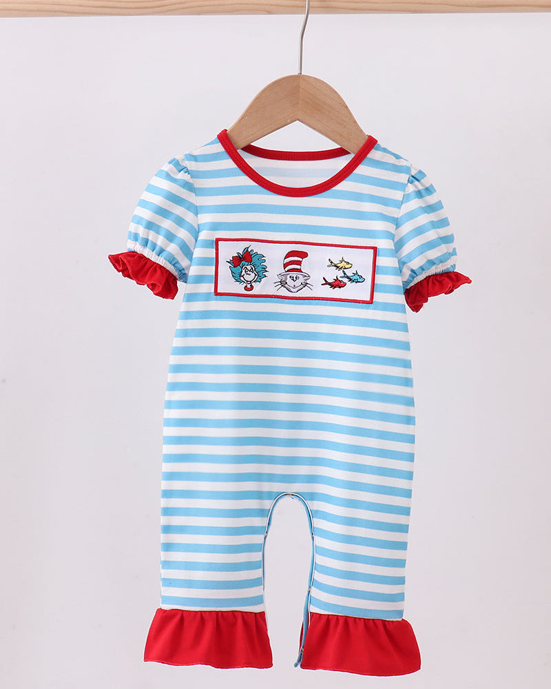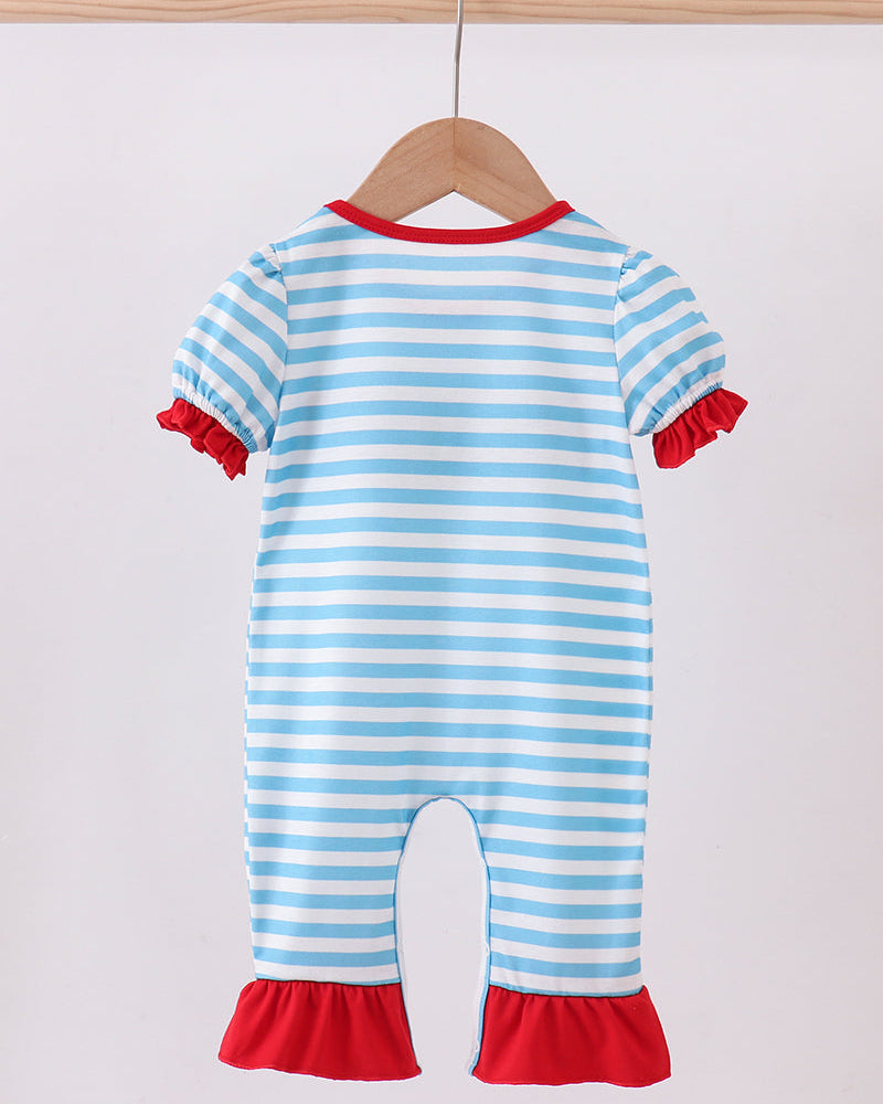 - Blue-and-white stripe romper with vibrant red ruffle details
