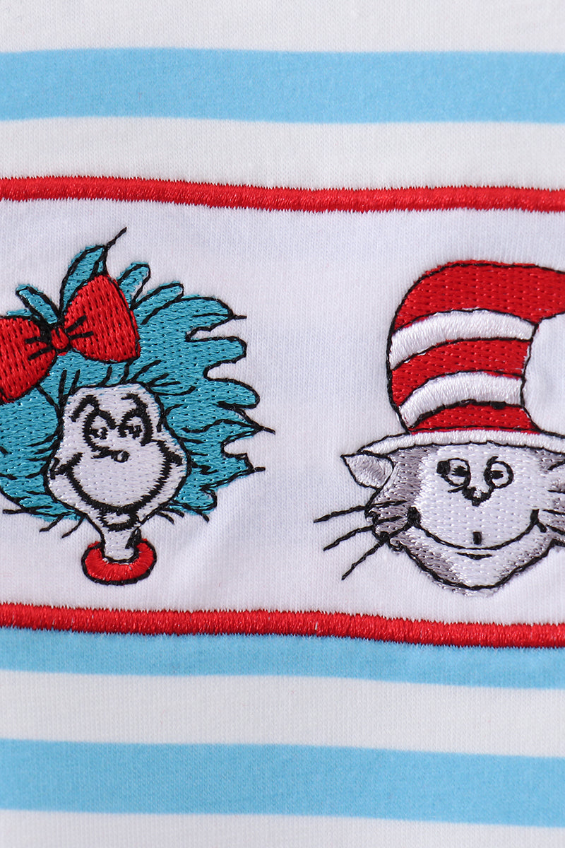 Across the chest, whimsical embroidered character friends add personality and imagination to her look, making this romper a standout for themed days, birthdays, photos, or everyday adventures.