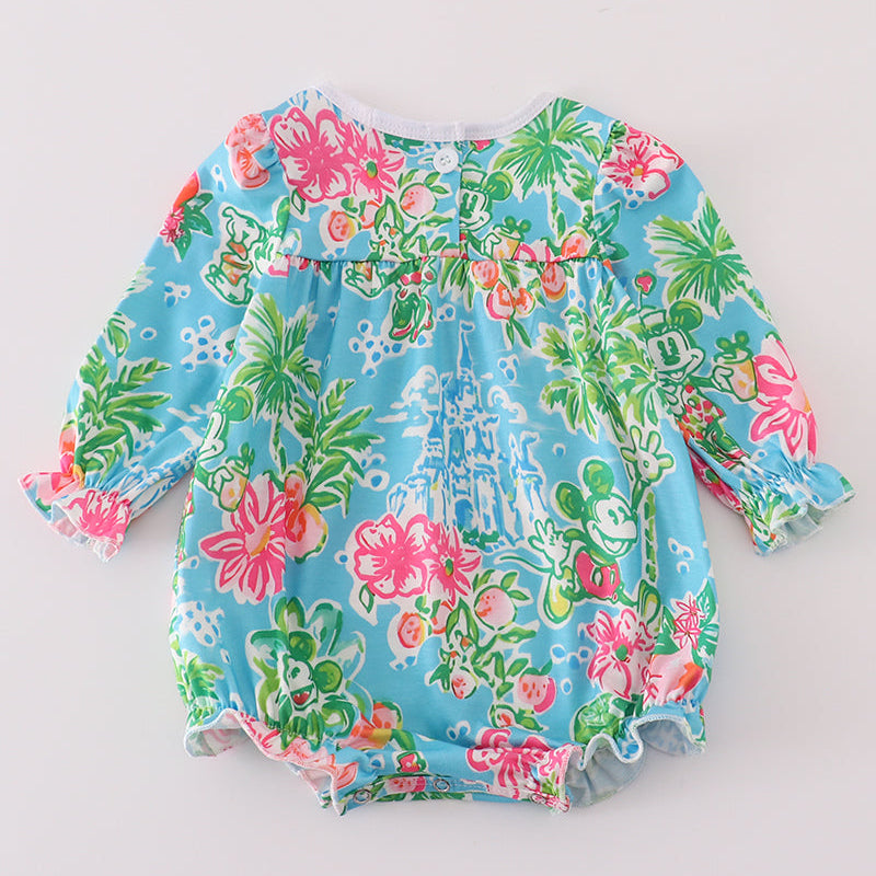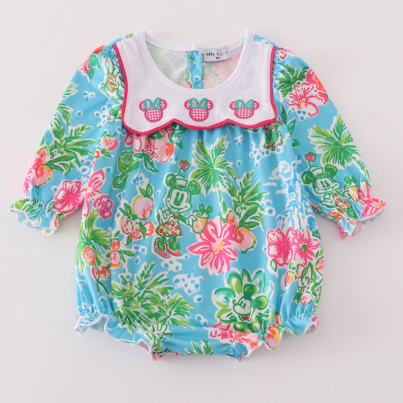 Keywords: Baby girl bubble romper, tropical romper, mouse character outfit, applique baby romper, summer baby clothes, cute baby girl outfit.