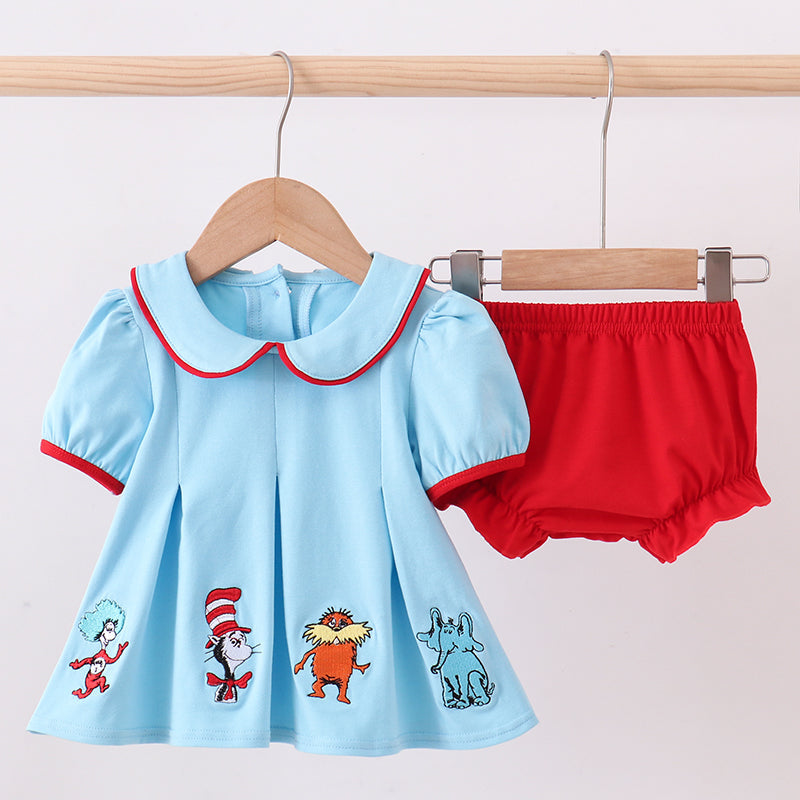 Colorful, quirky, and full of playful charm, our Whimsy Hat Friends Bloomer Set brings storybook fun to your little one’s wardrobe! This adorable two-piece outfit features a soft sky-blue top with bright red trim and pleated detailing, complete with whimsical embroidered characters across the hem for a cheerful, animated look.