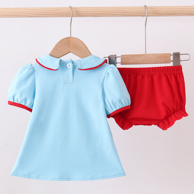 Puff sleeves and a Peter Pan collar add classic boutique sweetness, while the matching red bloomers offer comfort and easy movement for active little explorers. Perfect for school dress-up days, themed parties, vacations, or simply adding a little joy to her everyday outfits.