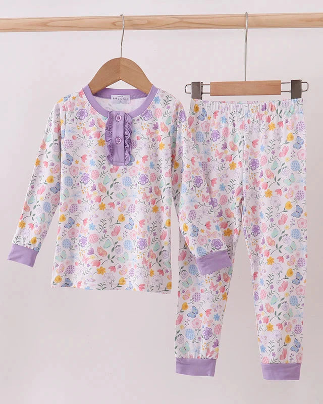 Drift into sweet dreams with the Butterfly Blossom Bamboo Girl Pajama Set. Featuring a whimsical print of butterflies and garden blooms on a soft pastel base, this two-piece set is made from buttery-soft bamboo fabric that’s breathable, eco-friendly, and gentle on sensitive skin. The long-sleeve top has lavender trim and button details, while the matching pants feature a comfy elastic waistband and snug cuffs for the perfect fit.