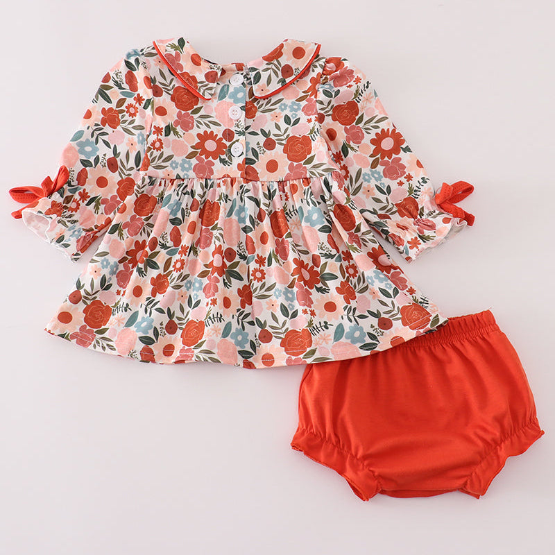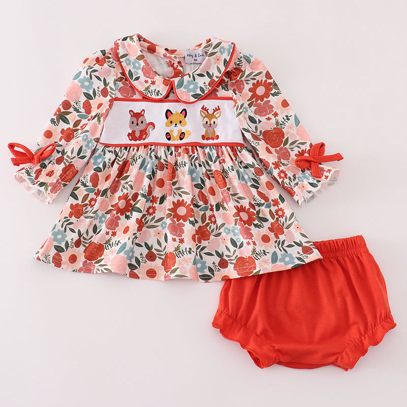 Dress your little one in woodland charm with our Forest Friends Embroidered Floral Girl Bloomers Set. This delightful 2-piece outfit features a long-sleeve floral top adorned with a playful embroidered panel showcasing an adorable fox, squirrel, and deer. The soft cotton fabric ensures all-day comfort, while the peter pan collar and dainty red bow accents on the sleeves add a sweet, classic touch. Paired with vibrant red bloomers featuring an elastic waistband, this set is perfect for playdates, family outings, or capturing those precious seasonal photos.