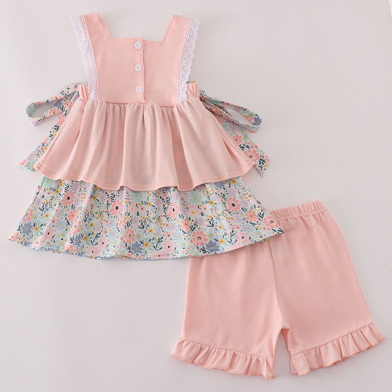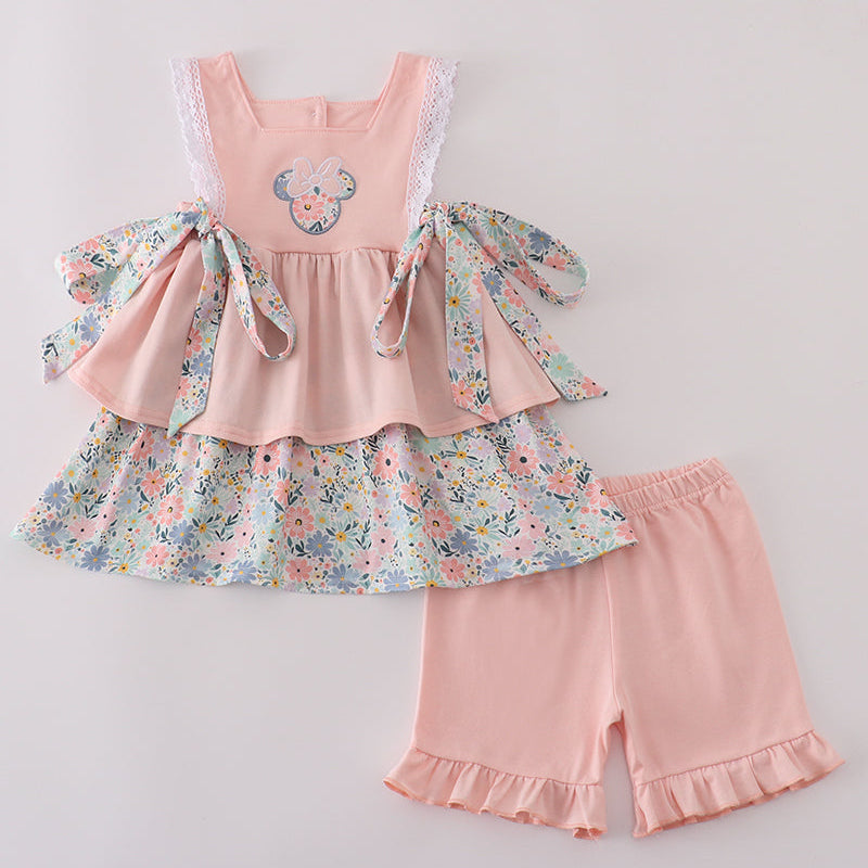 Sweet, whimsical, and full of charm—our Meadow Magic Mouse Ruffle Shorts Set is made for little ones who love twirling through their day! This adorable outfit features a soft pink layered top with a floral magic mouse applique, lace trim accents, and floral bow ties at the sides for the cutest finishing touch. The matching pink ruffle shorts offer stretchy comfort, perfect for play, outings, and picture-worthy moments.