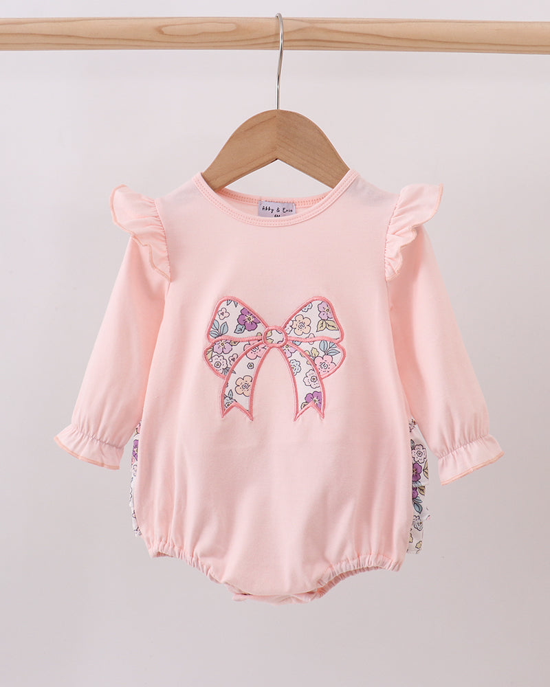 The Millie Bloom Bow Bubble is a darling blend of charm and comfort, perfect for your baby girl’s special moments. Designed in a soft blush pink hue, this bubble features a beautiful floral bow applique and delicate ruffle accents on the shoulders and sleeves for that classic boutique look.