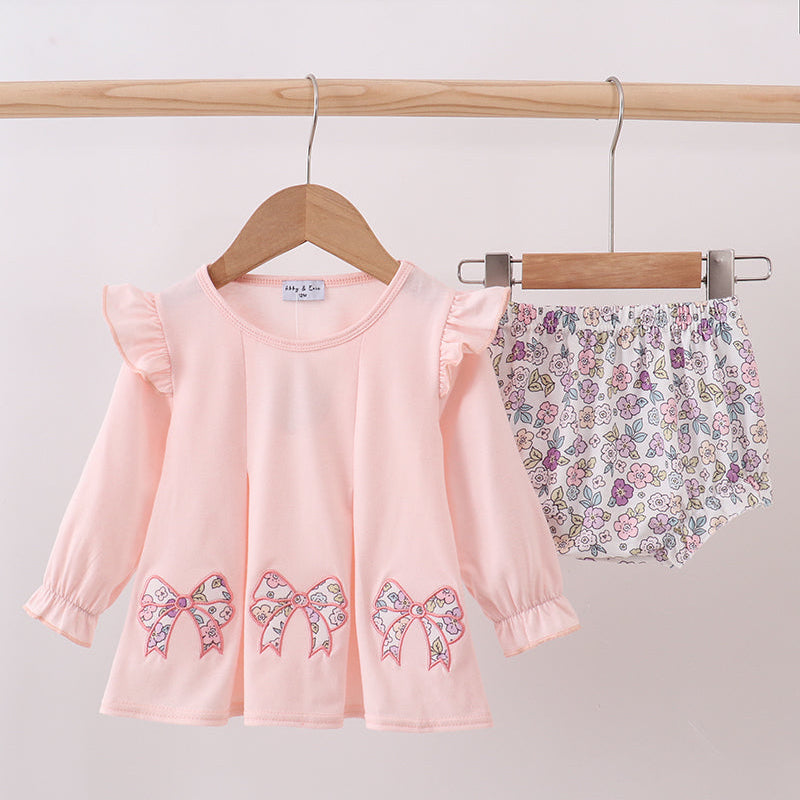 Dress your little darling in timeless sweetness with our Millie Bloom Bow Ruffle Bloomer Set. This precious two-piece features a blush pink ruffle-sleeve top adorned with embroidered floral bows, paired with coordinating floral bloomers for the perfect spring look.