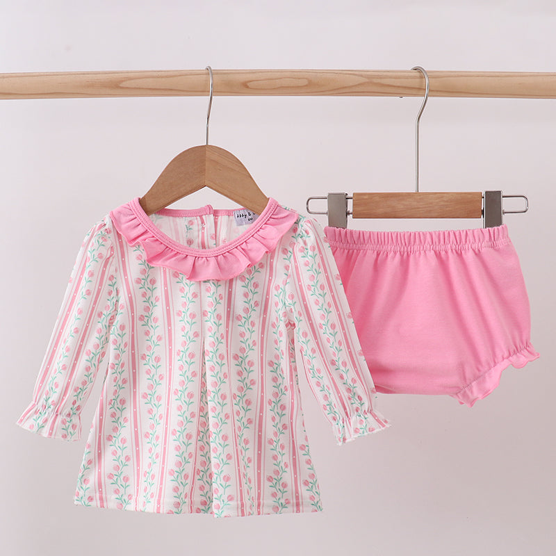 Your little one will bloom with charm in our Sweet Tulip Trail Ruffle Bloomer Set. This darling outfit features a floral-striped long sleeve top with a pink ruffle collar, paired with matching pink bloomers trimmed in sweet ruffles for the perfect finishing touch.