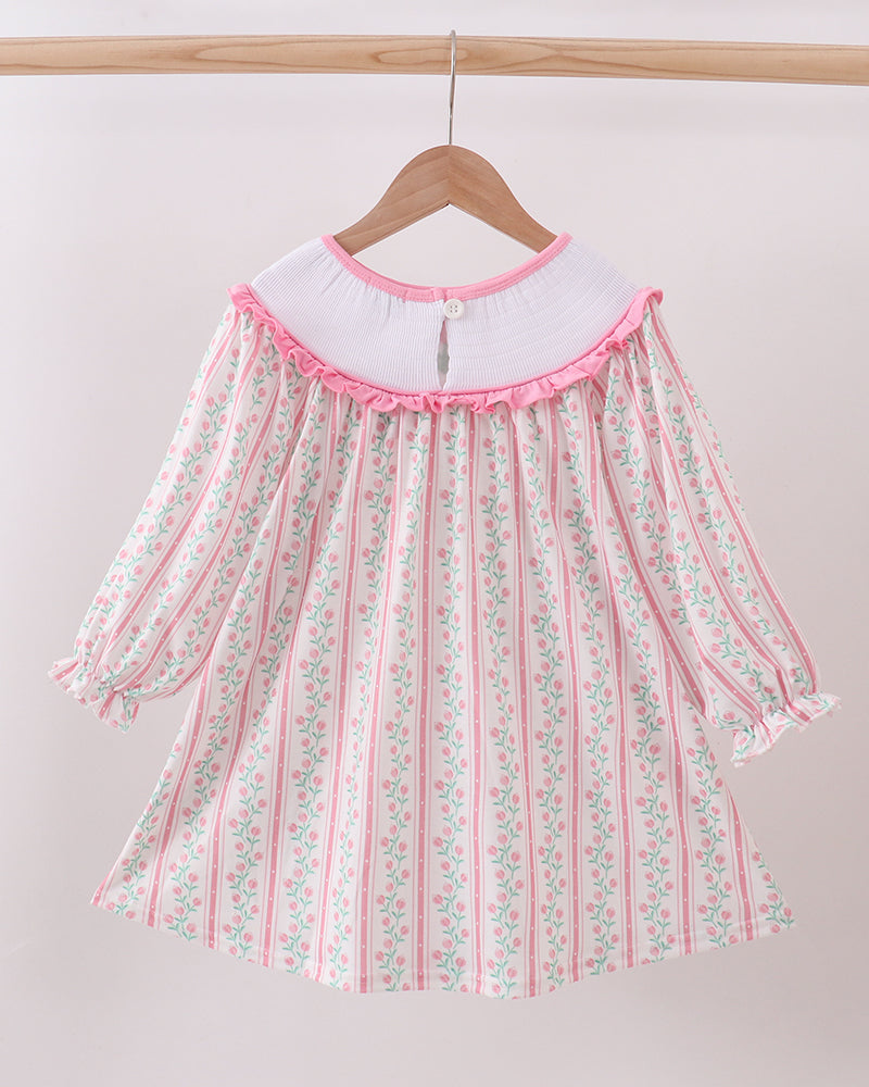 The soft pink floral stripe print and long puff sleeves make it perfect for cool spring mornings, Easter celebrations, or family portraits. Crafted from lightweight, breathable cotton-blend fabric, it ensures comfort without compromising on style.