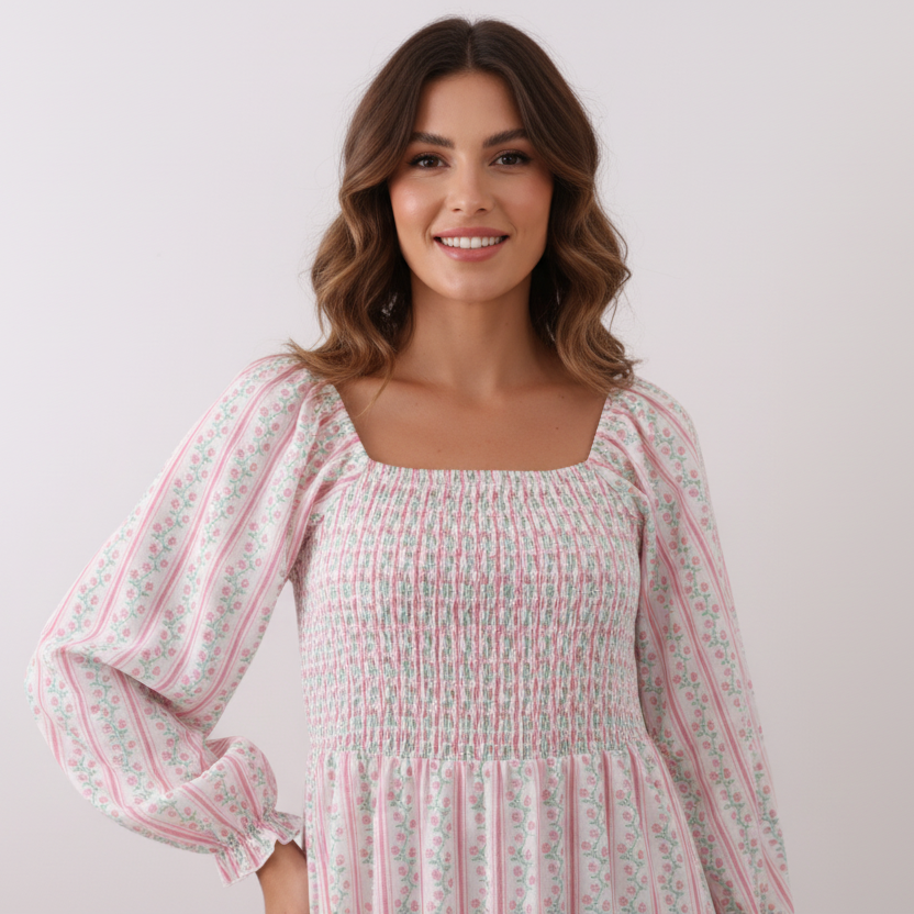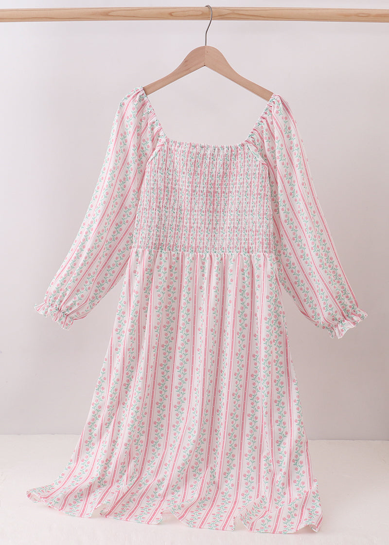 The Sweet Tulip Trail Smocked Women’s Dress brings effortless beauty to your everyday wardrobe. Featuring soft pink floral stripes and a flattering smocked bodice, this dress combines elegance and comfort in perfect harmony.