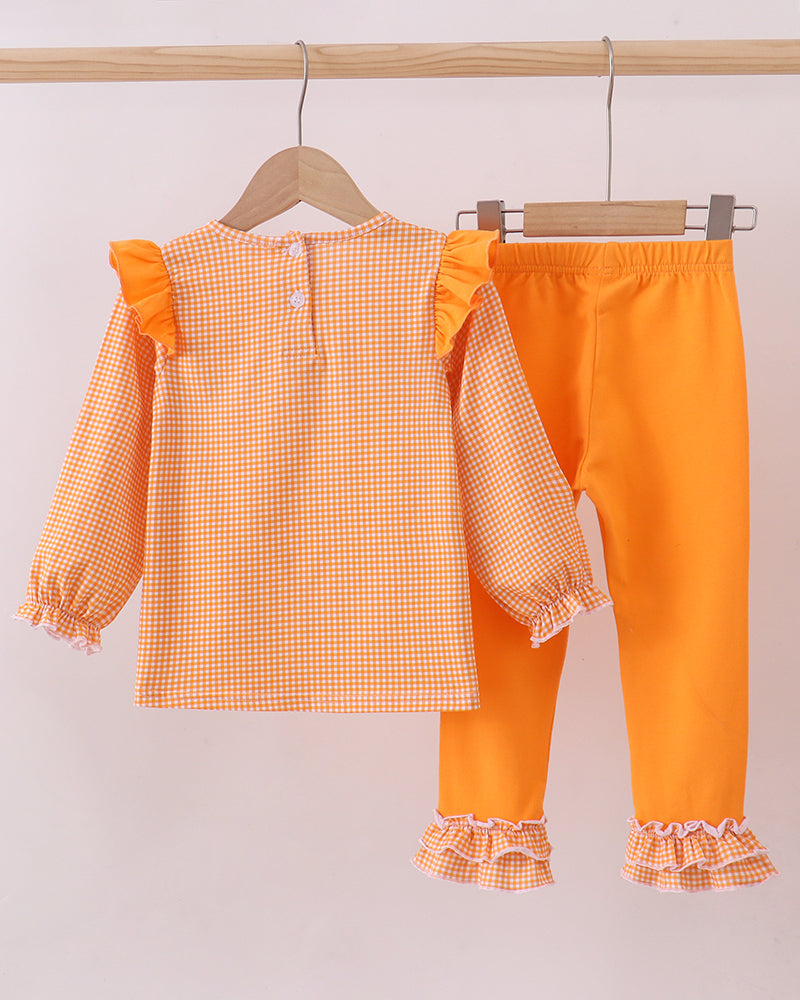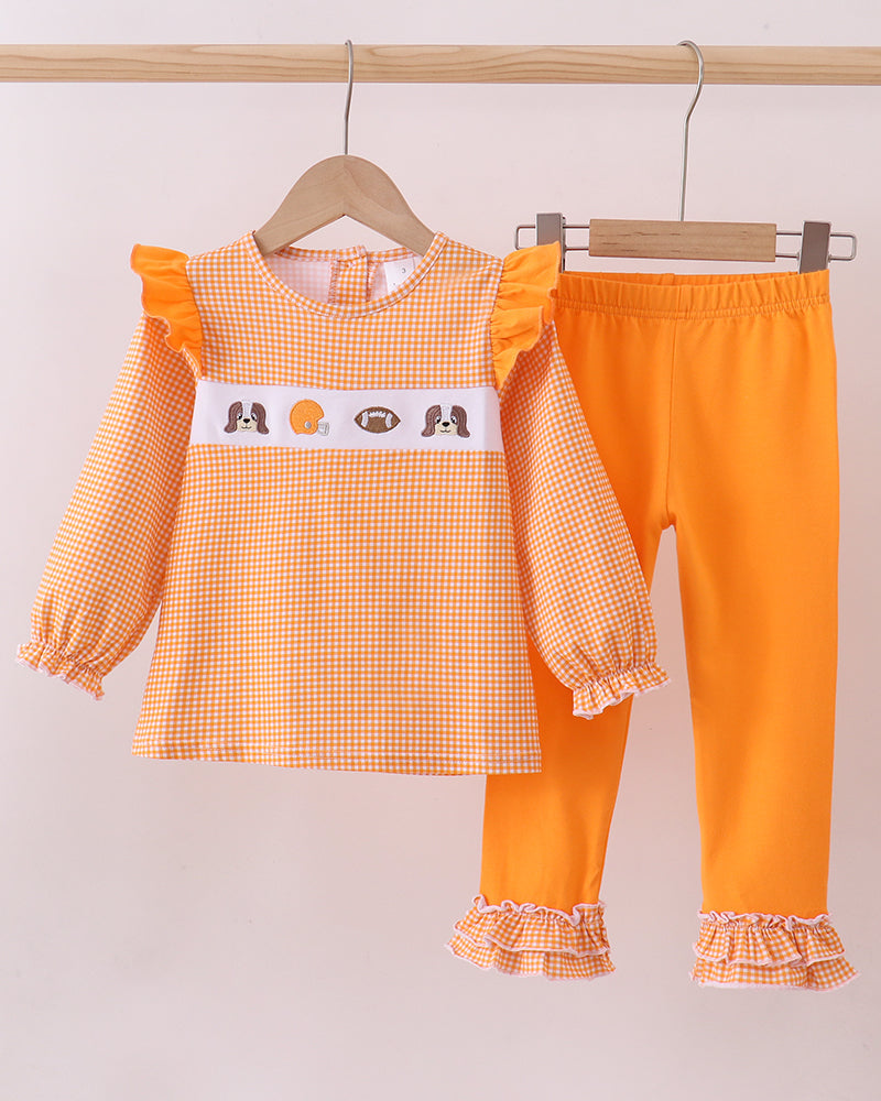The top features a sweet Smokey puppy football embroidery with playful ruffle shoulders and gingham checks, while the matching ruffle hem pants complete the outfit with boutique flair. Crafted from soft, breathable cotton, it’s perfect for cheering on the Vols, fall festivals, or everyday southern style.