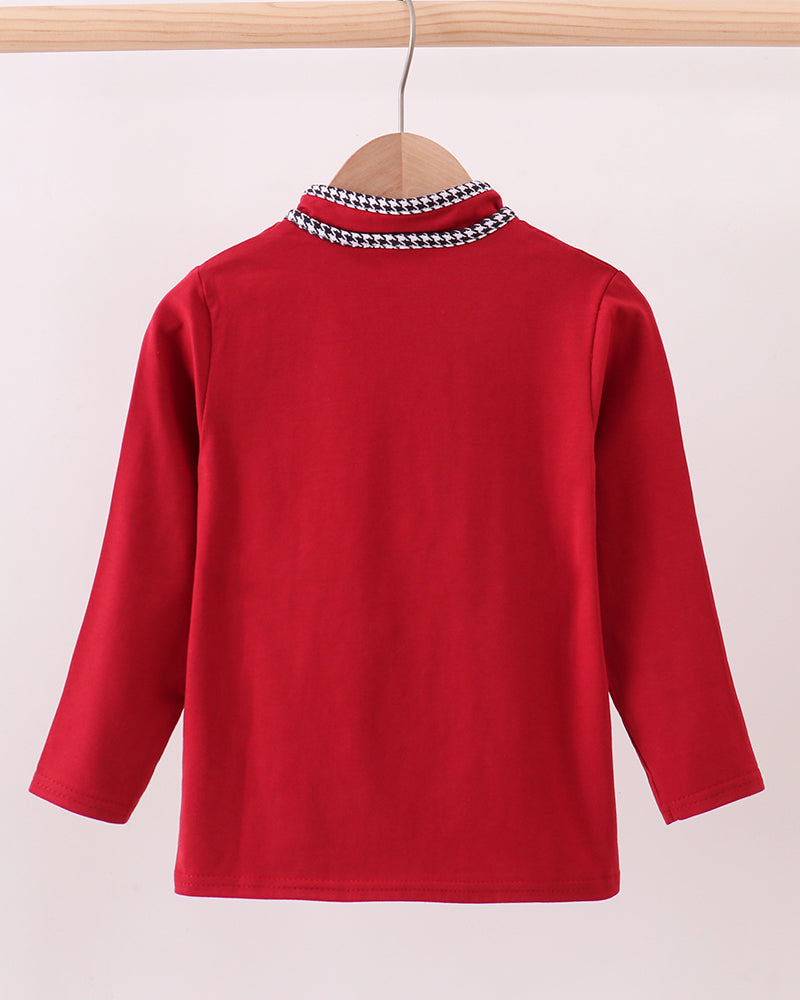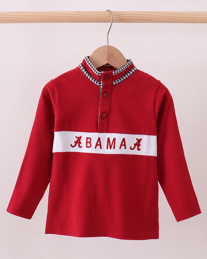 Dress your little champ in timeless southern spirit! Our Crimson Houndstooth Varsity Boy Top blends classic game-day style with everyday comfort. Featuring a bold crimson body, contrast white chest panel with varsity-style lettering, and signature houndstooth trim at the collar and placket, this pullover brings iconic charm to every fall gathering.