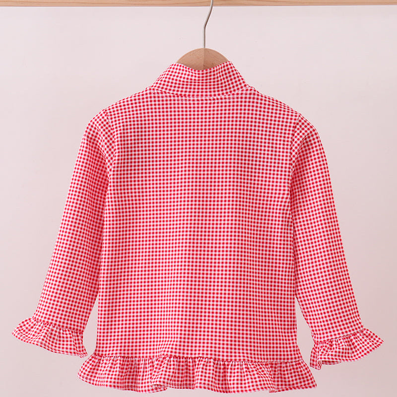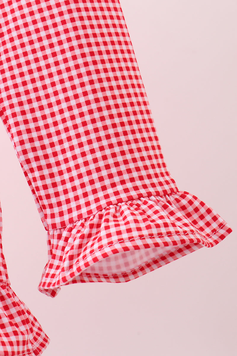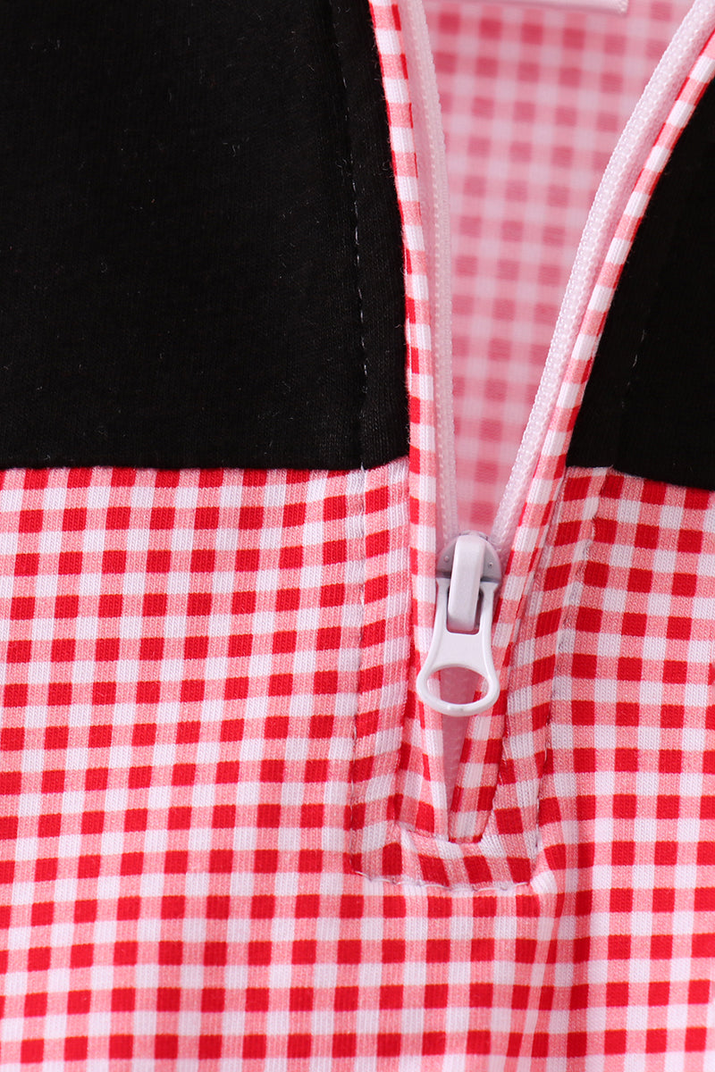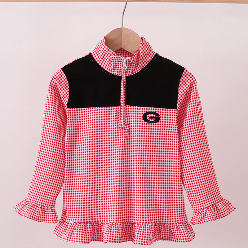 Your little girl will steal the spotlight on game day in our Dawg Pride Ruffle Zip Pullover! This adorable top blends southern charm with spirited style, featuring a red gingham body, contrast black yoke, and sweet ruffle trim at the hem and cuffs. The embroidered dawg detail and sporty quarter-zip neckline give it the perfect mix of cute and game-day ready.