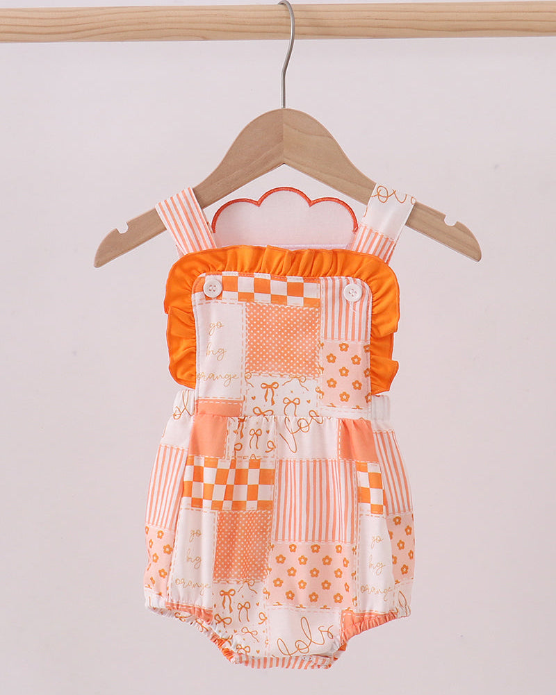 Show off team spirit in the sweetest way with the Volunteer Spirit Patchwork Bubble. This adorable one-piece romper features a cheerful mix of orange-toned patchwork prints on the front, paired with a bold varsity-style “T” applique on the back for a standout look from every angle.