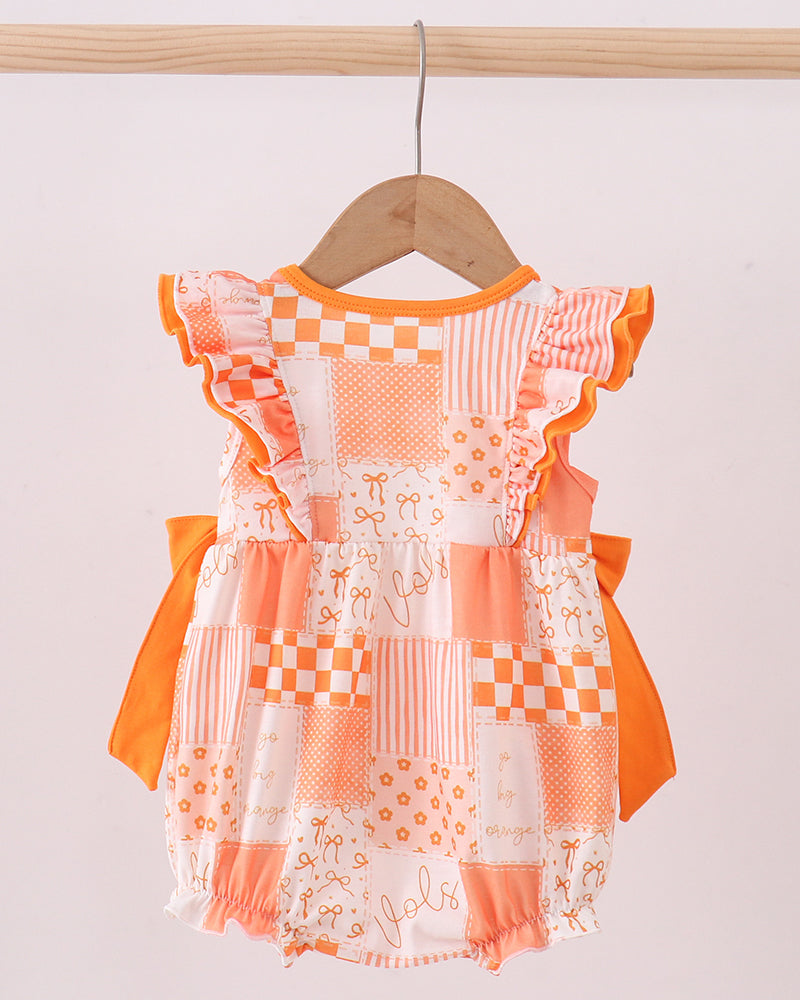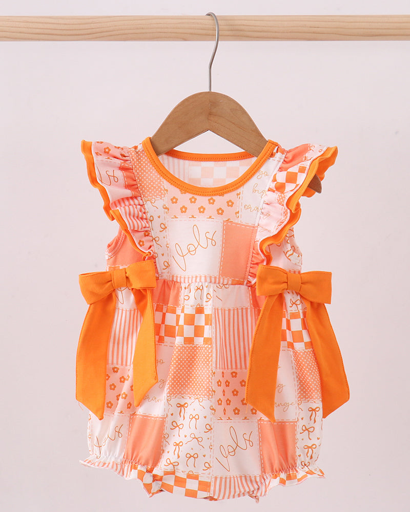 Cheer on your favorite team in the sweetest way with the Volunteer Spirit Patchwork Ruffle Bubble. This darling bubble romper features a playful orange patchwork design inspired by Volunteer pride, complete with ruffle-trimmed sleeves and oversized bow accents at the sides for extra boutique charm. The vibrant orange hues make it a standout choice for game day celebrations.