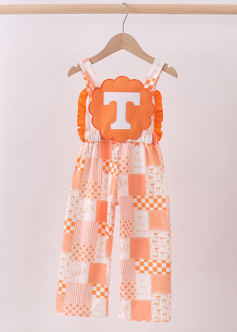 Cheer on game day in standout style with the Volunteer Spirit Patchwork Ruffle Jumpsuit. This eye-catching one-piece features a playful orange patchwork design accented with sweet ruffle trim and wide-leg pants for a fun, vintage-inspired look. The show-stopping back proudly displays a bold Tennessee “T” appliqué, making this jumpsuit perfect for true Volunteer fans.