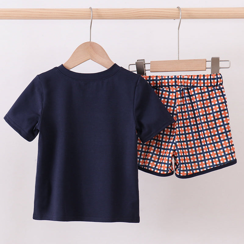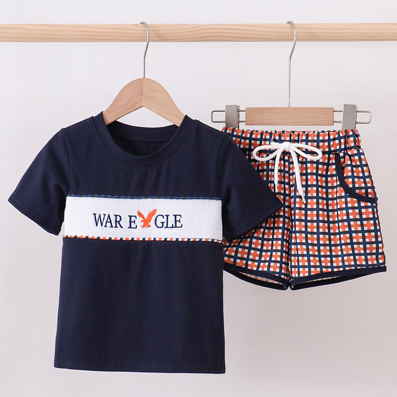 Get your little fan ready for kickoff with the War Eagle Game Day Smocked Boy Shorts Set, a classic and spirited outfit perfect for football season. This two-piece set features a navy short-sleeve top with a smocked chest panel embroidered with “War Eagle” in coordinating orange and blue tones for timeless Southern game day style.