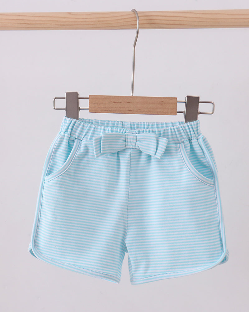 An elastic waistband ensures an easy, comfortable fit, while the adorable front bow adds a sweet, feminine detail. Finished with side pockets and gently curved hems, these shorts combine practicality with timeless style—ideal for playdates, outings, or lounging at home.