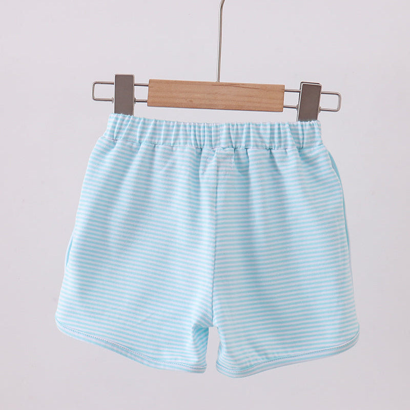Easy to mix and match with tees, tanks, or coordinating tops, the Elynn Sky Blue & White Stripe Bow Shorts are a must-have for your little one’s wardrobe.
