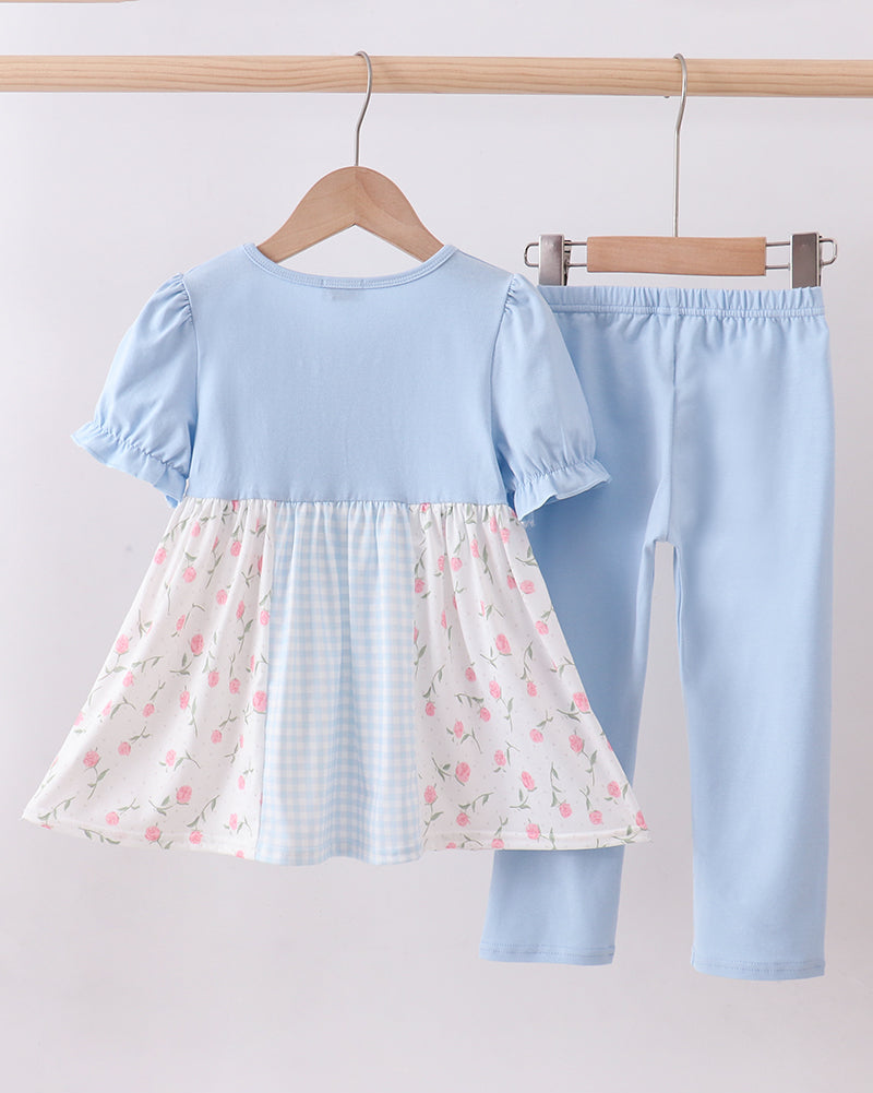 Soft, feminine, and effortlessly classic, the Arden Blue Floral Girl Pants Set is a beautiful blend of comfort and charm. This two-piece outfit features a light blue tunic-style top with delicate floral and gingham paneling, accented by ruffle trim and button details for a timeless boutique look.