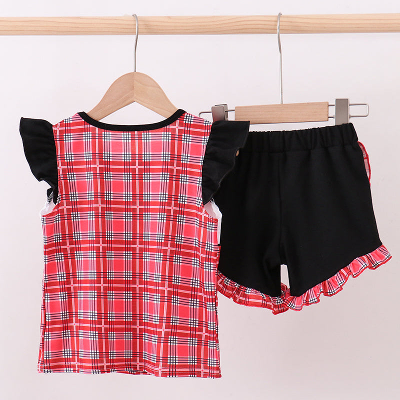 - Two-piece set: smocked plaid top + matching ruffle shorts