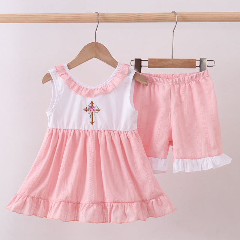 The flowing pink jacquard skirt-style top pairs perfectly with matching pink shorts finished with gentle ruffle hems, creating a comfortable and elegant look for little girls. Lightweight and breathable, this set is ideal for Easter Sunday, church services, family gatherings, and spring celebrations.