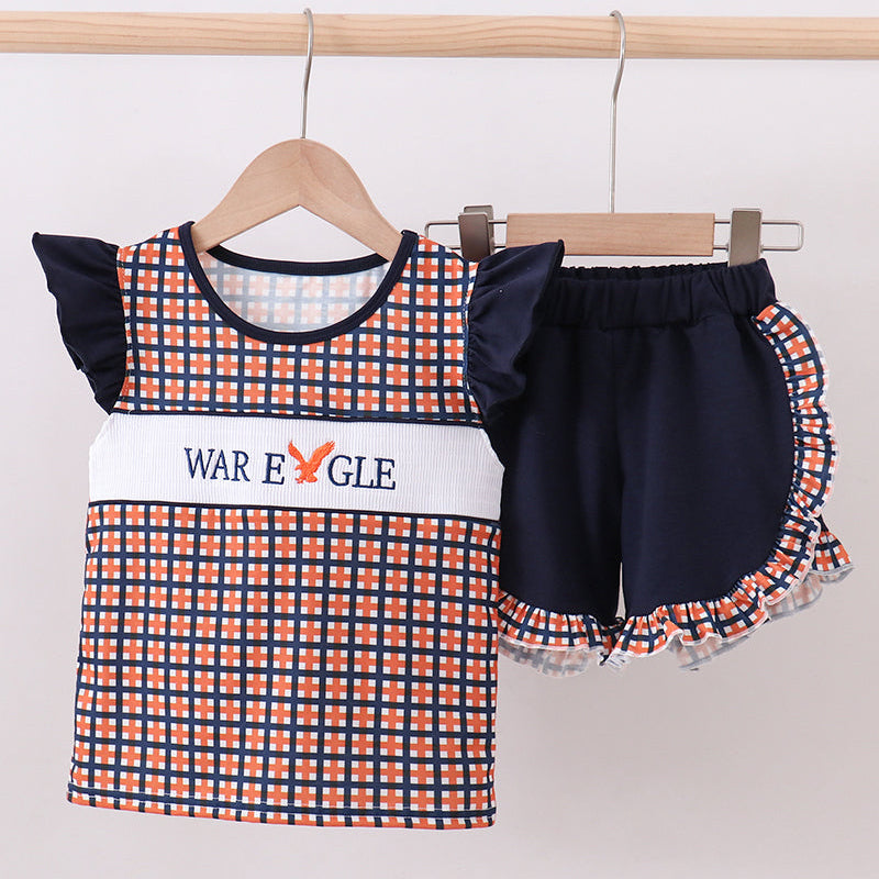 Get your little fan game-day ready in the War Eagle Game Day Smocked Ruffle Short Set! Designed in classic Auburn navy and orange, this adorable two-piece set combines spirited style with all-day comfort.