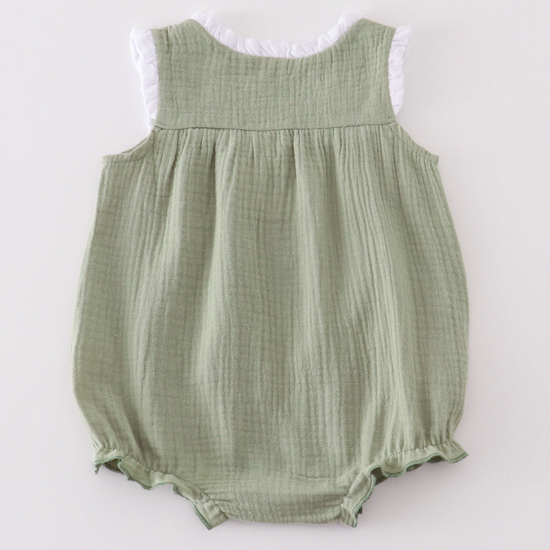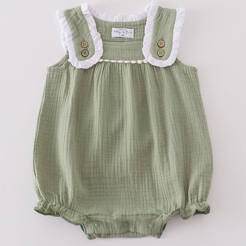 The Elara Premium Sage Ruffle Bubble is a timeless piece designed with both charm and comfort in mind. Made from soft, breathable muslin cotton, this boutique-style bubble features delicate white ruffle straps with wooden button accents for a vintage-inspired look. The gentle sage green hue gives it a fresh, classic feel, perfect for every season.