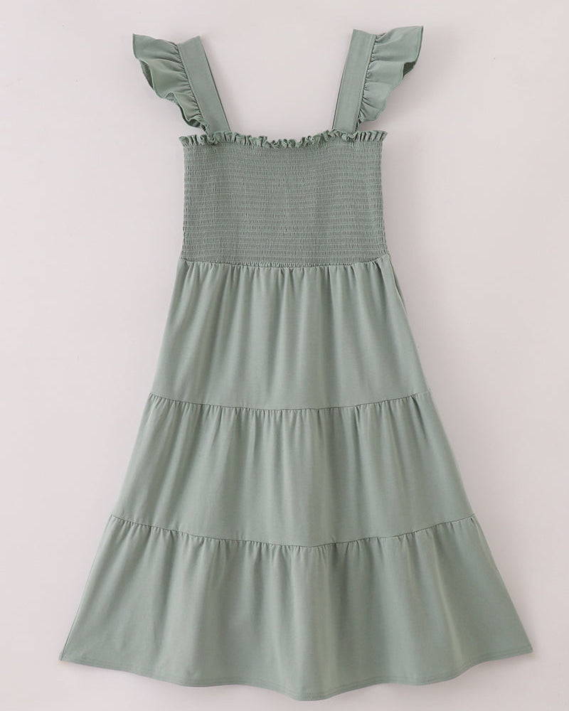 Keywords: sage green midi dress, smocked bodice women’s dress, tiered ruffle dress, casual fall dress, sleeveless sundress