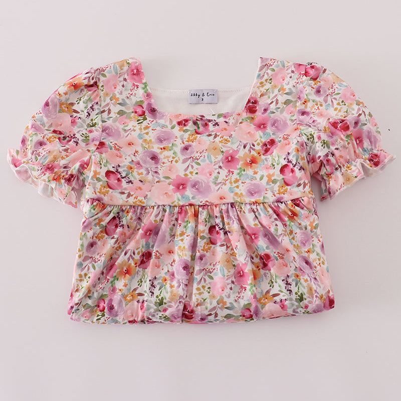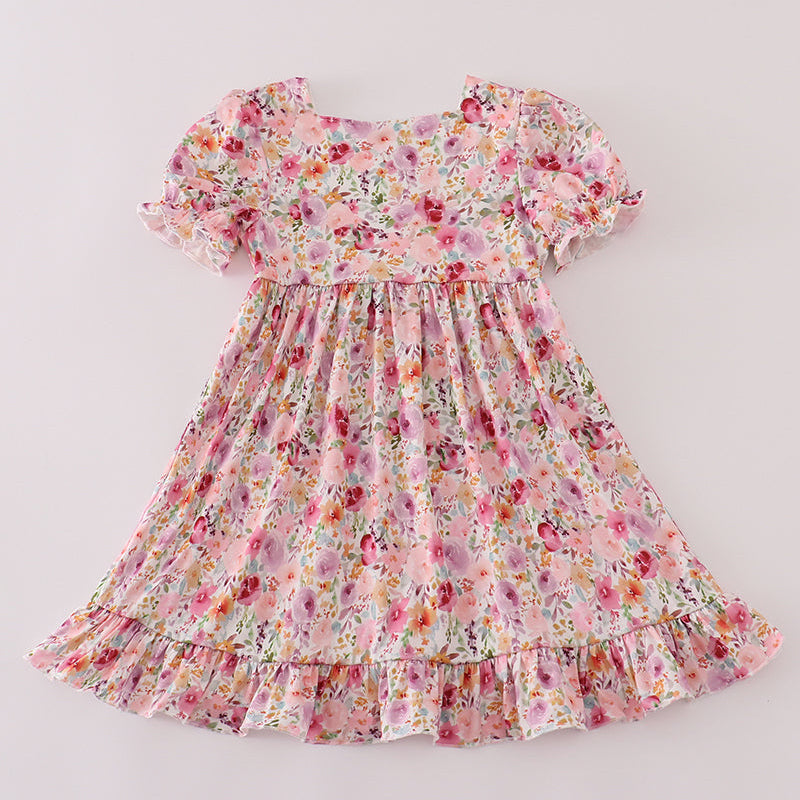 The matching girl’s dress mirrors the same enchanting floral print, featuring a sweet square neckline, puff sleeves, and a ruffle-trimmed hem that gives her all the twirls she could wish for. Soft, lightweight fabric ensures comfort for all-day wear, whether she’s dancing barefoot in the backyard or posing for family pictures.