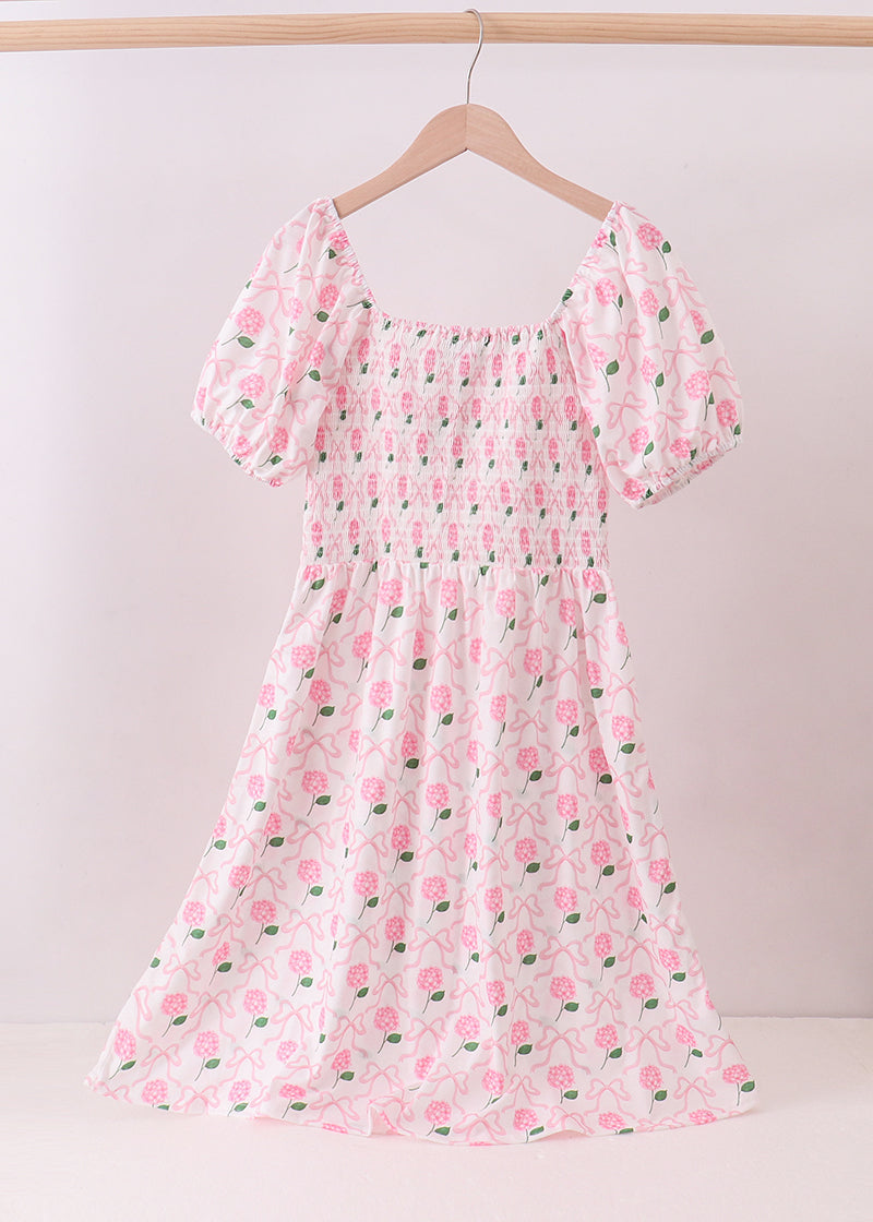 Feminine, flattering, and effortlessly timeless, the Hydrangea Darling Smocked Women’s Dress is designed to bring classic charm to everyday elegance. Featuring a delicate pink hydrangea and bow print, this dress is finished with a fully smocked bodice that offers both comfort and a beautiful, flexible fit.