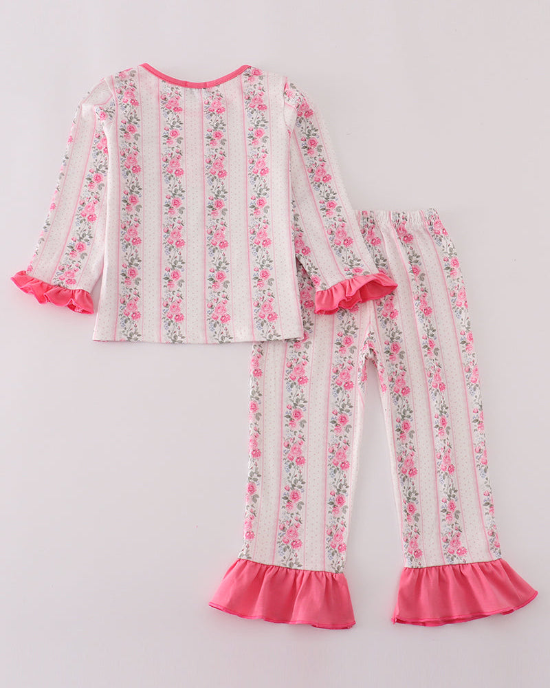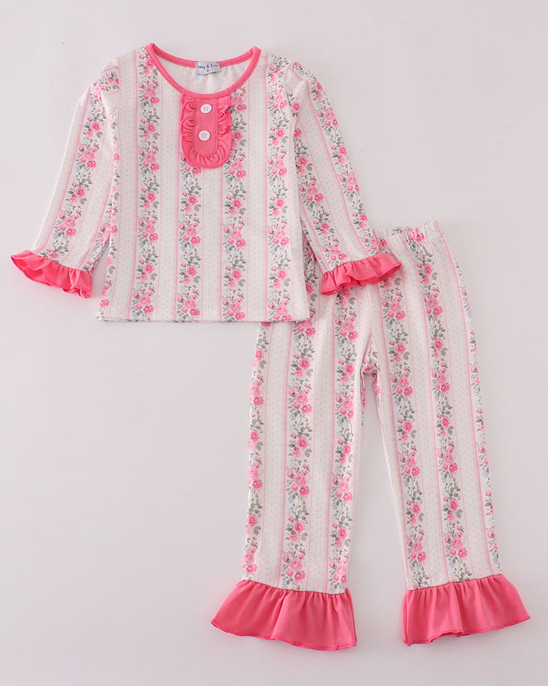Drift off in cozy charm with our Nora Pink Floral Print Ruffle Pajamas Set. This sweet sleepwear features a soft floral stripe design, ruffled cuffs, and a buttoned front detail for a timeless, feminine touch. Made from comfy fabric perfect for lounging or bedtime snuggles. Ideal for little girls who love classic style and soft pink hues.