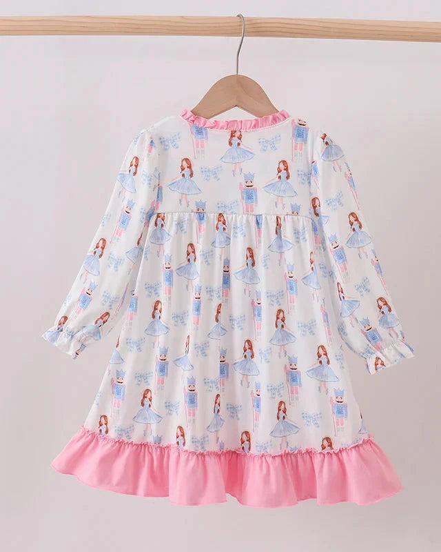 Step into the magic of the season with our Nutcracker Waltz Ruffle Nightgown — a charming holiday favorite inspired by the classic Christmas ballet. This sweet dress features a delicate print of ballerinas, Nutcrackers, and festive bows in pastel hues of pink and blue.