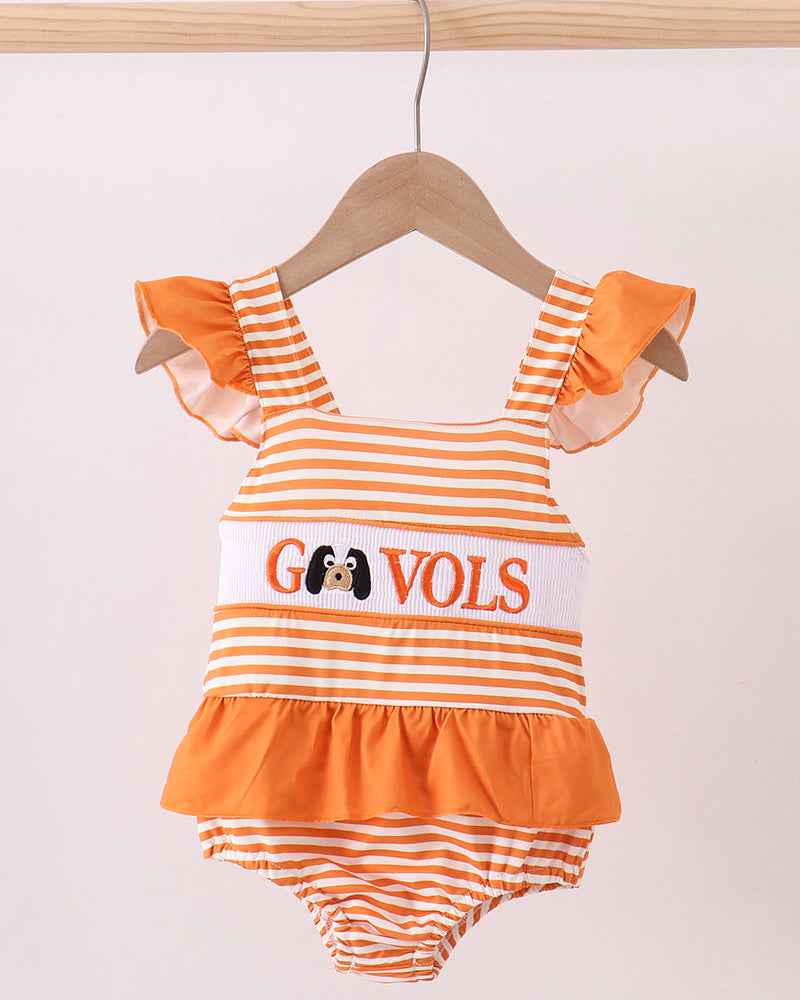 One-piece girls swimsuit with smocked “Go Vols” embroidery