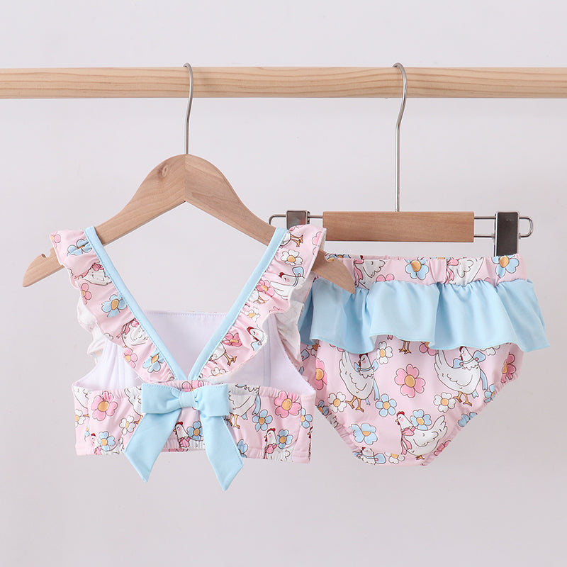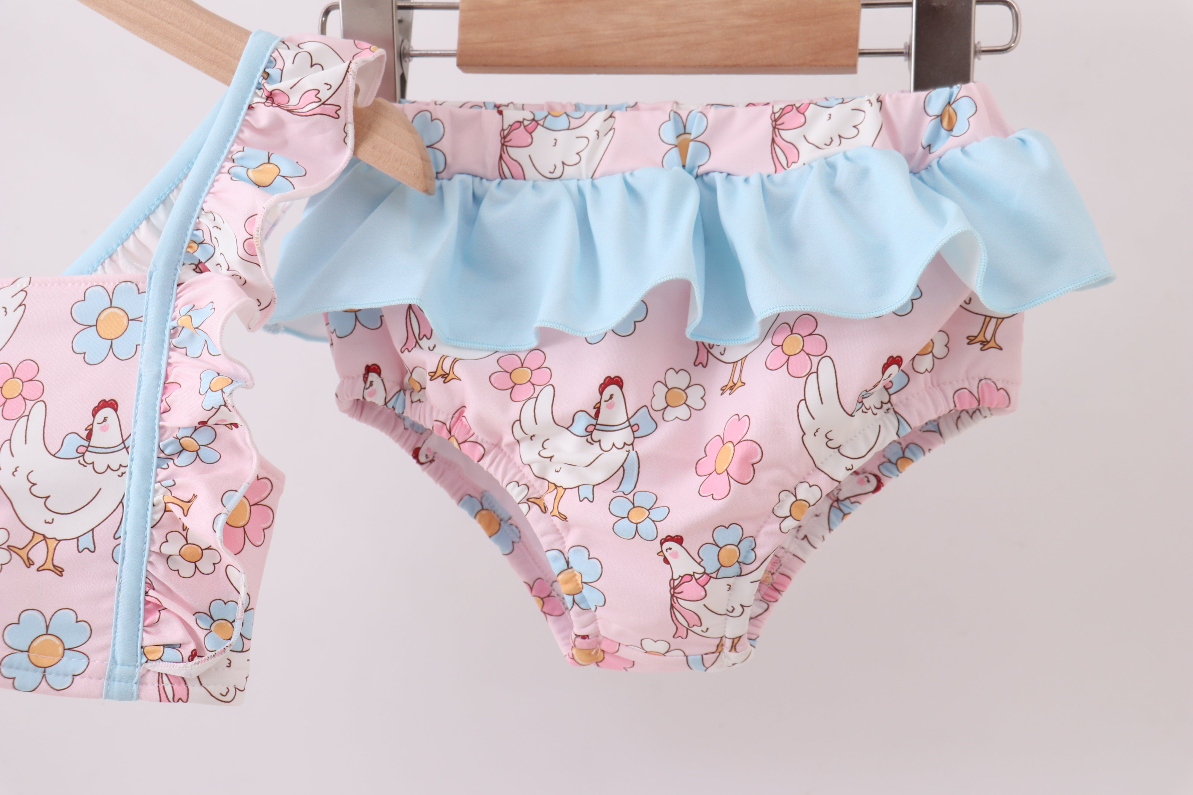 Make a splash in sweet country style with the Happy Hens Floral 2pc Ruffle Swimsuit! This adorable two-piece swimsuit features a charming hen and floral print paired with soft pastel tones for the perfect mix of playful and precious.