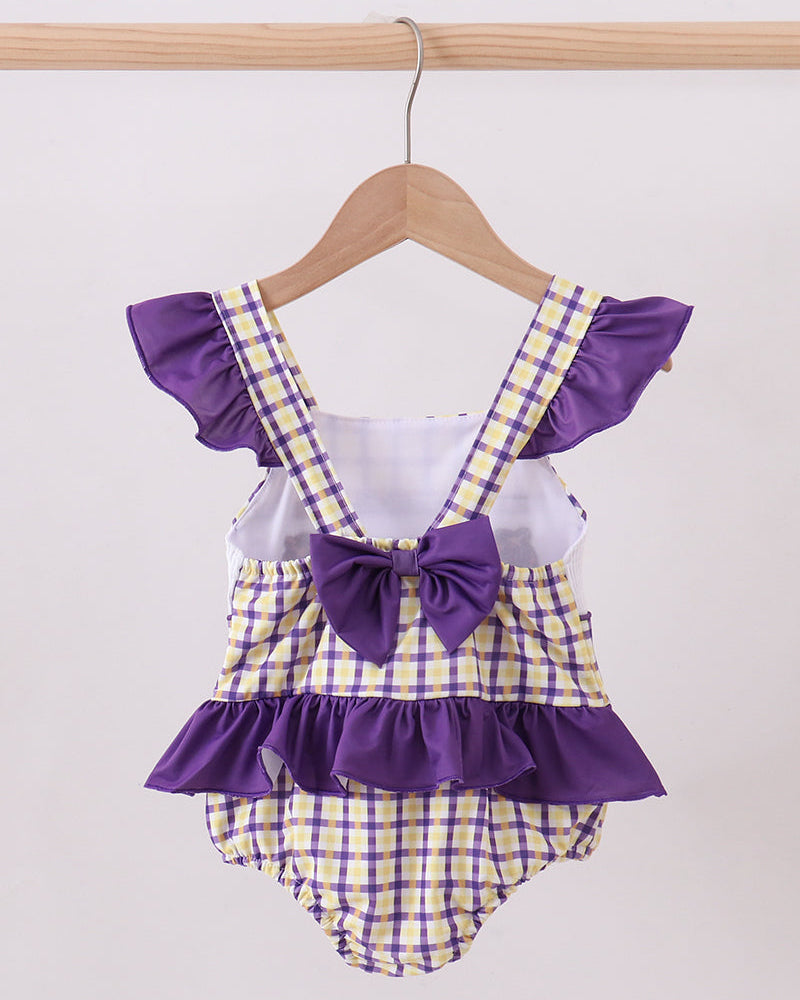 Cheer on the Tigers in sweet Southern style with the LSU GEAUX Smocked Ruffle Swimsuit! This one-piece swimsuit features classic purple and gold gingham paired with a smocked “GEAUX” panel and embroidered tiger details for the ultimate LSU fan look.