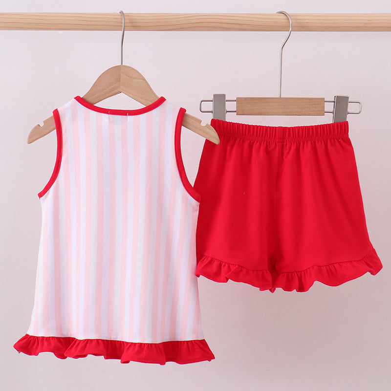 Hit a home run in adorable style with the Baseball Darling Stripe Ruffle Shorts Set! This sporty-sweet two-piece outfit features a sleeveless striped top with playful ruffle accents and an embroidered baseball bat detail, paired with matching red ruffle shorts for a complete game-day look.